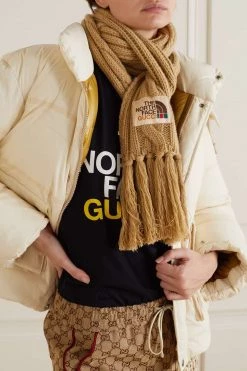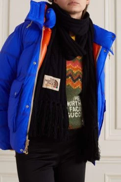 GUCCI + The North Face Schal Aus Wolle In Zopfstrick Mit Applikation Und Fransen ,Schwarz