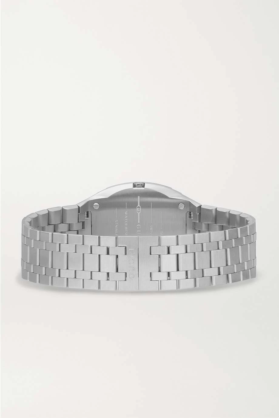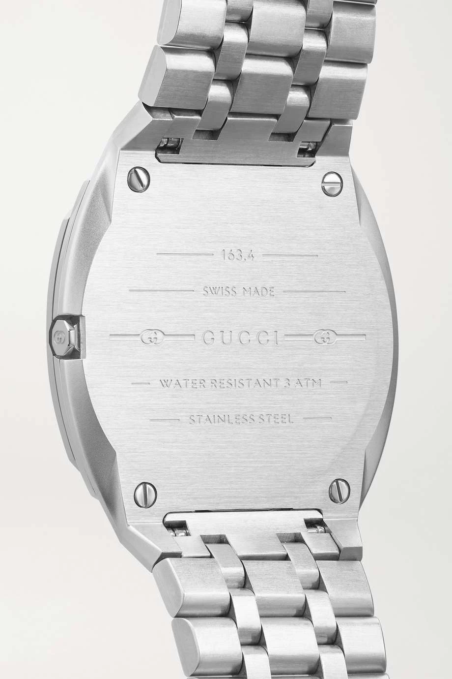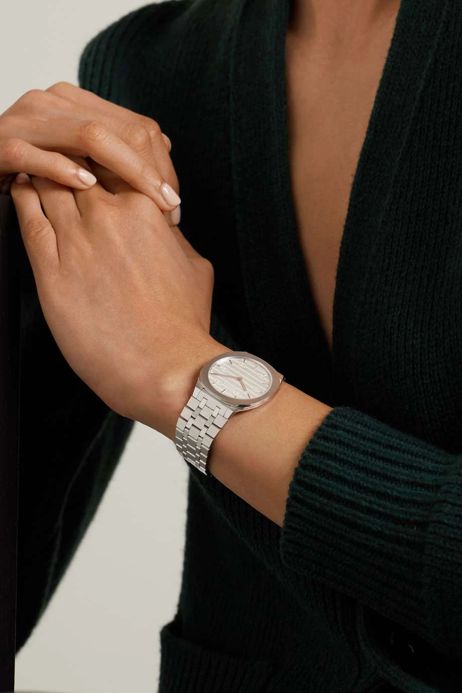 Die sportliche, ansprechend schmale „25H“ Uhr von Gucci wurde aus Edelstahl gefertigt und verströmt 70er-Jahre-Flair. Sie zeigt sich mit einem Zifferblatt im Sonnenschliff, das von Gravuren in Form des berühmten „GG“-Logos der Marke geziert wird. Der Zeitmesser hat ein Schweizer Quarzuhrwerk und ein Gliederarmband mit verdeckter Faltschließe, das besonders schlicht wirkt.