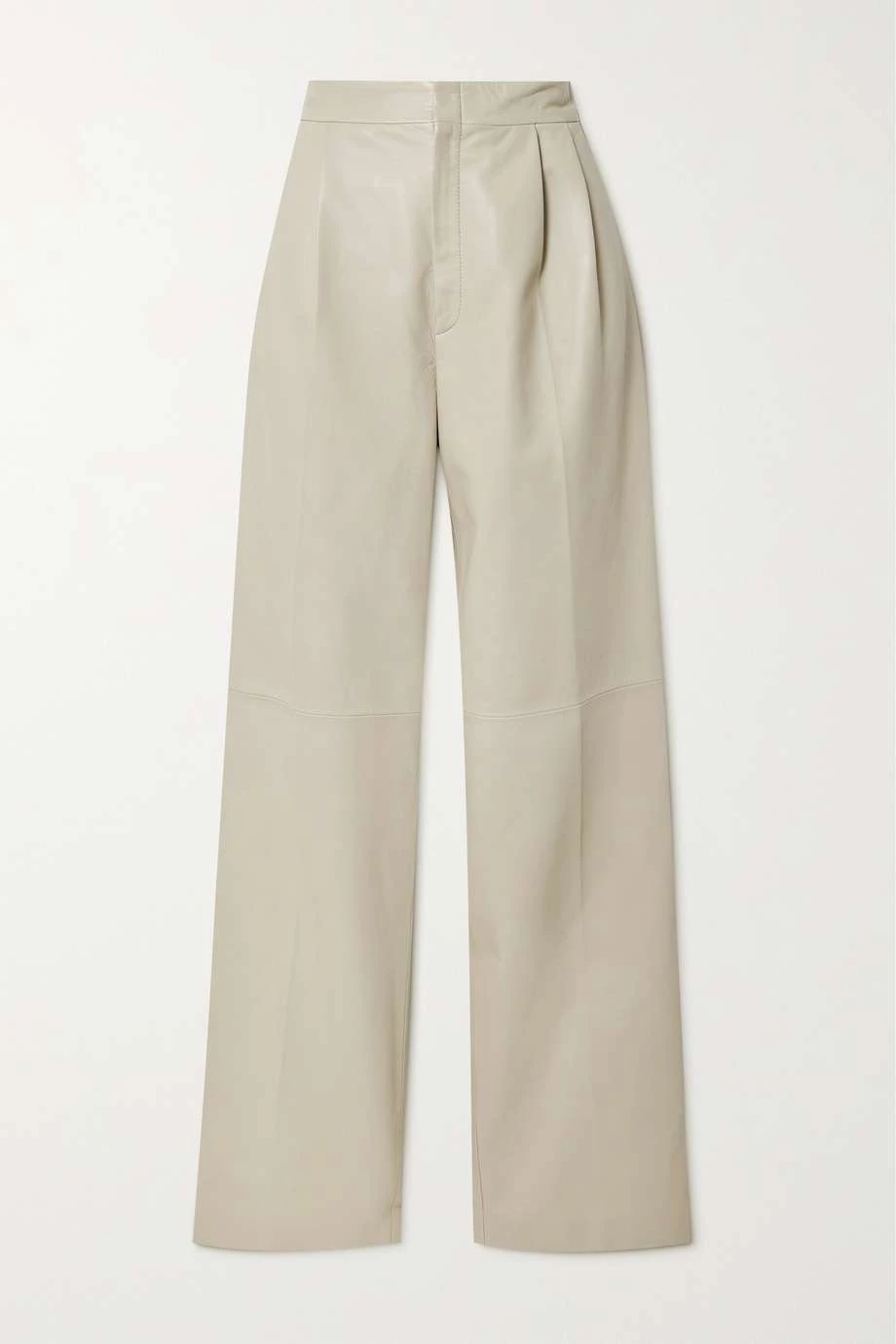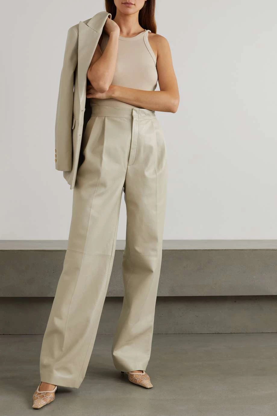 Für die „Aria“ Kollektion, die Gucci zum 100-jährigen Bestehen des Hauses herausbringt, wurden klassische Modelle mit einer zeitgemäßen Note entworfen. Diese Hose hat einen traditionellen Schnitt, wobei sie aus elegantem kieselgrauem Leder besteht. Zudem erzielen Falten am hoch sitzenden Bund ein noch weiteres Bein. Wir tragen High Heels und den passenden Blazer dazu.