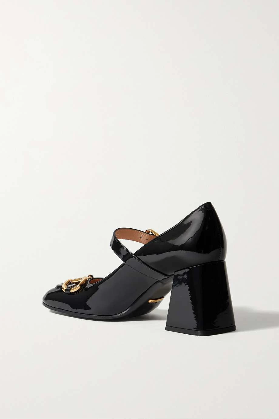 Die femininen „Baby“ Pumps von Gucci verströmen eindeutig Retro-Flair. Diese in Italien gefertigte Version aus schwarzem Lackleder zeigt sich mit einer Schnalle am Riemen sowie einer karreeförmigen Kappe, die mit dem markentypischen goldfarbenen „Horsebit“-Detail besetzt ist. Verkürzte Hosen und Röcke bringen den skulpturalen Blockabsatz besonders gut zur Geltung.