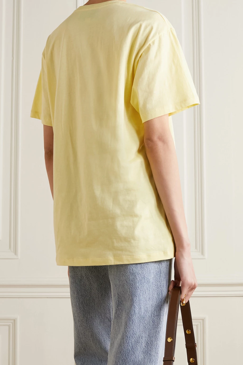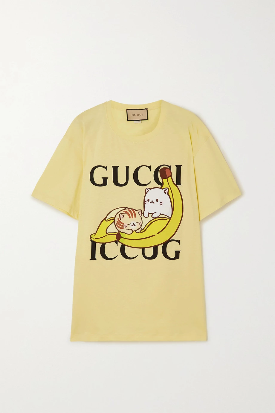 In Zusammenarbeit mit der japanischen Zeichentrickserie Bananya hat Gucci eine verspielte Capsule-Kollektion kreiert, die Ihnen mit Sicherheit ein Lächeln ins Gesicht zaubern wird. Dieses Oversized-T-Shirt ist mit zwei süßen Kätzchen bedruckt, die in Bananenschalen hausen.