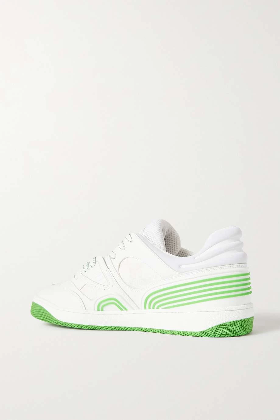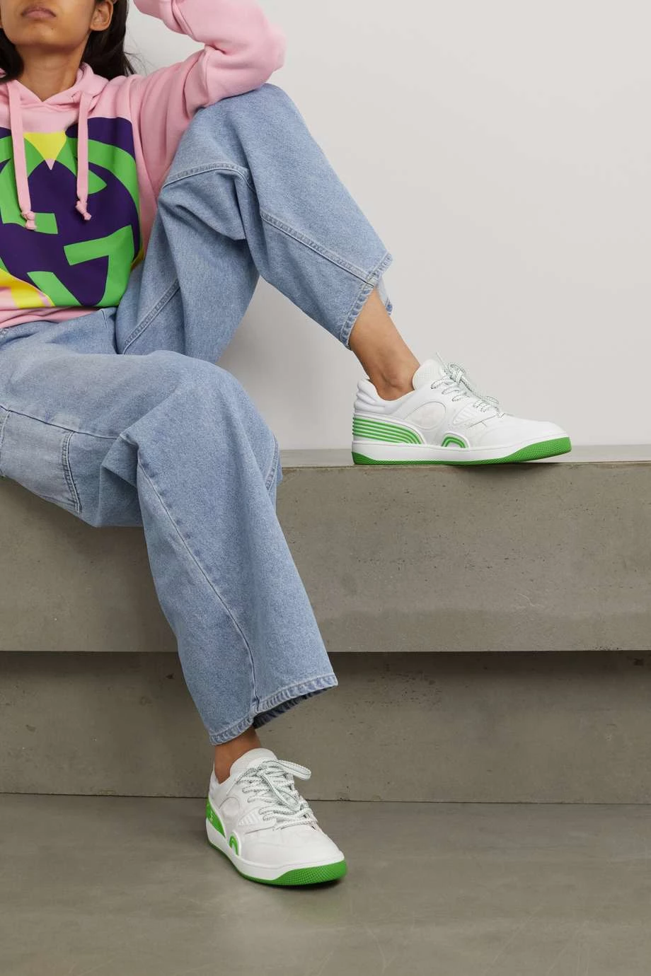 Die „Basket“ Sneakers von Gucci basieren auf klassischen Basketballschuhen aus den 90er-Jahren. Sie wurden in Italien aus Kunstleder sowie Partien aus „GG Supreme“-Canvas gefertigt und mit grünen Gummiakzenten gestaltet. Das Paar hat zudem eine strukturierte Sohle und ist innen angenehm gepolstert.