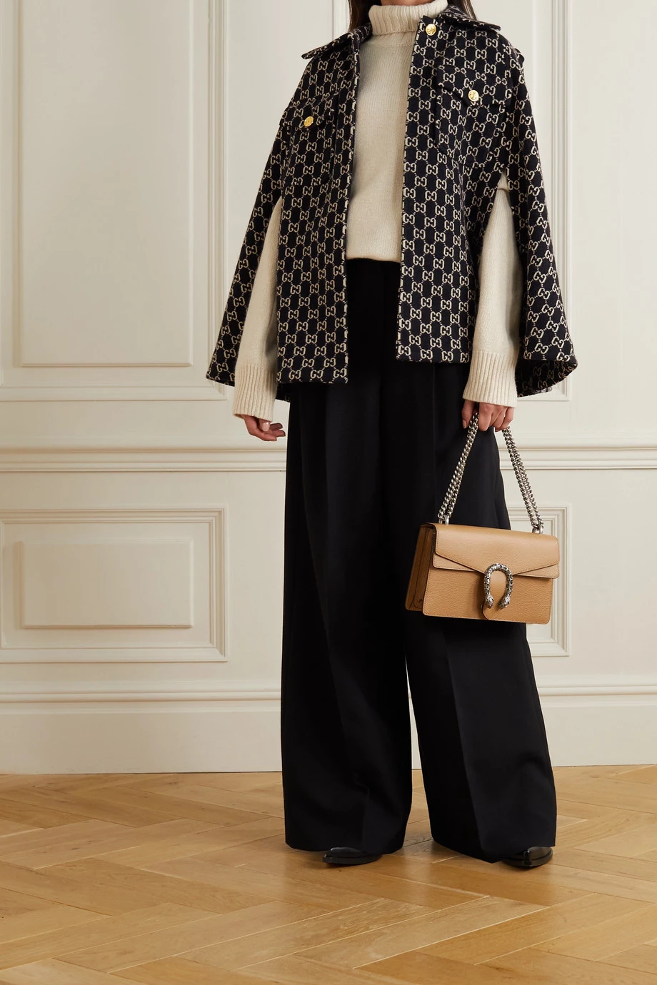 Dieses Cape stammt aus der „Epilogue“ Kollektion von Gucci, die eine Ode an die zeitlosesten Modelle und Muster der letzten fünf Jahre unter der Leitung von Alessandro Michele darstellt. Es wurde in Italien aus wärmendem Woll-Jacquard gefertigt und mit dem „GG“-Motiv aus dem Archiv des Hauses gestaltet. Zudem zeigt es sich mit goldfarbenen Knöpfen, die mit einem Anker geprägt sind.