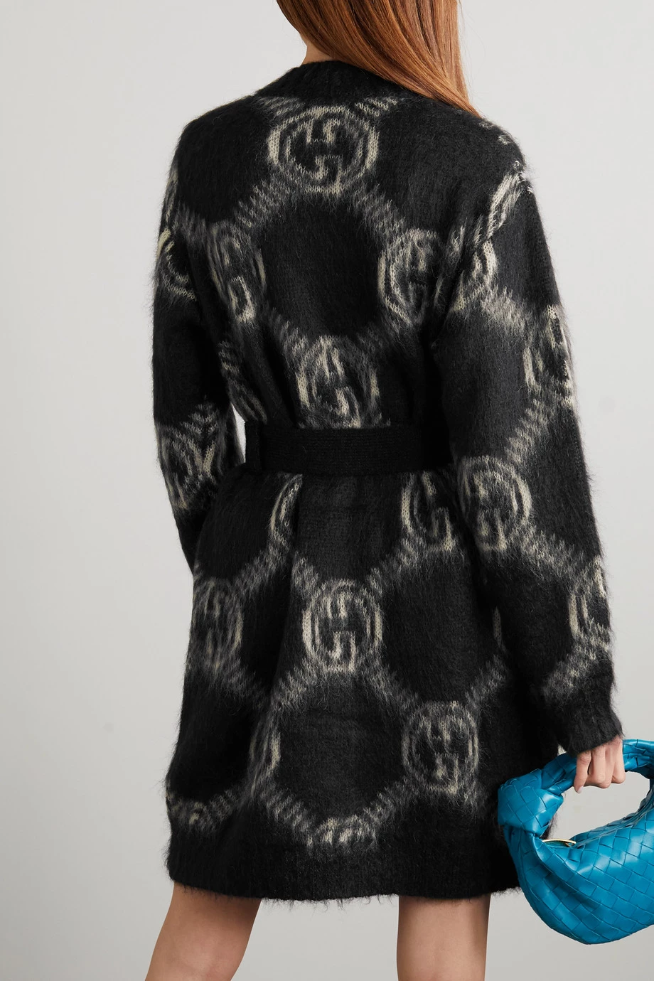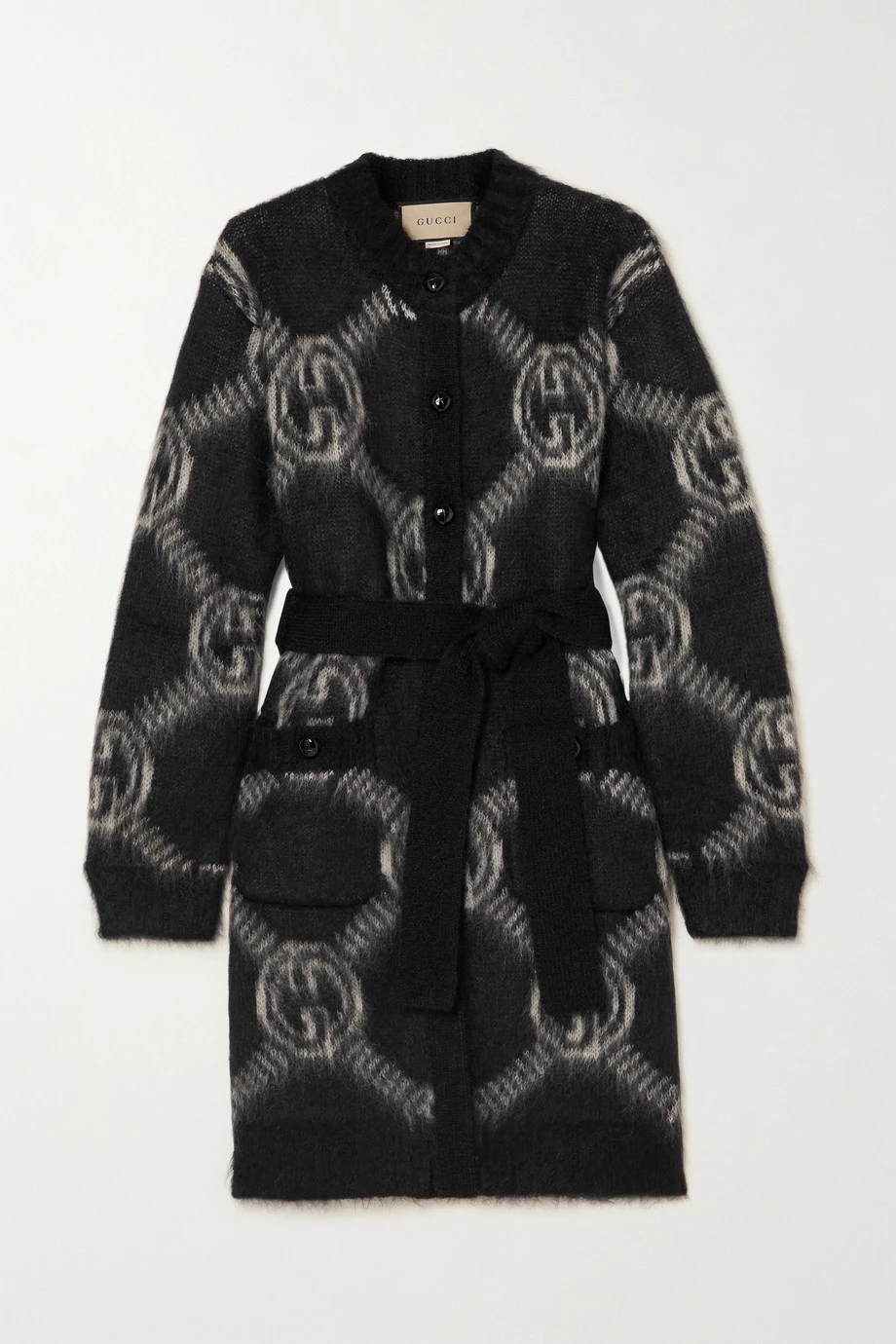 Das ineinandergreifende Monogramm von Gucci setzt stets ein Statement und bei diesem langen Cardigan, der vollständig damit versehen ist, noch mehr. Das Modell aus Jacquard-Strick aus einer flauschigen gebürsteten Mohairmischung ist besonders kuschelig und hat einen Bindegürtel.