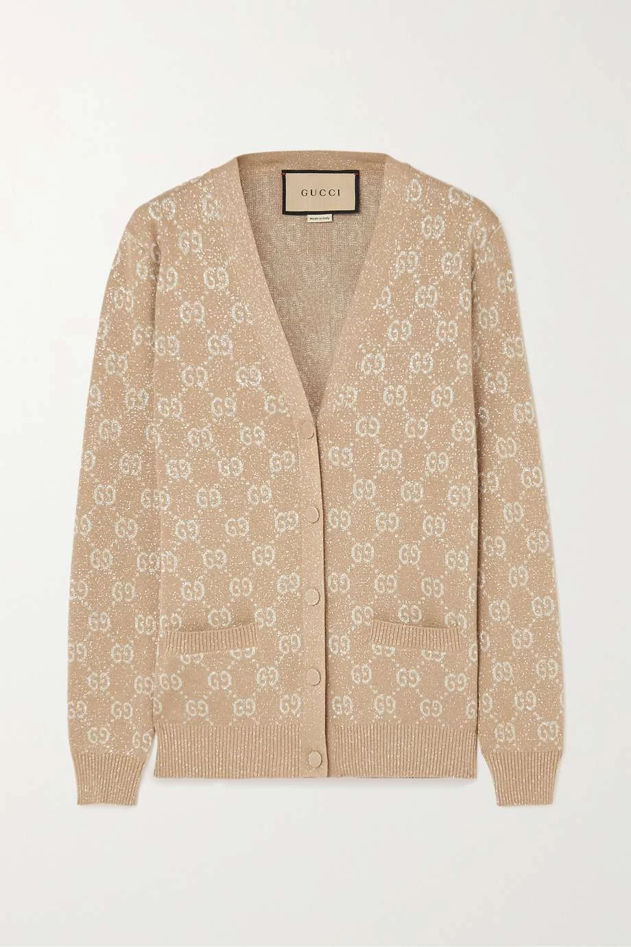 Dieser in Italien gefertigte Cardigan von Gucci besteht aus beigefarbenem Jacquard-Strick und wird von Metallic-Garnen durchzogen, die eindrucksvoll funkeln. Das Modell zeichnet sich durch ein Muster aus dem Monogramm der Marke aus und hat eine Reihe überzogener Knöpfe an der Vorderseite.