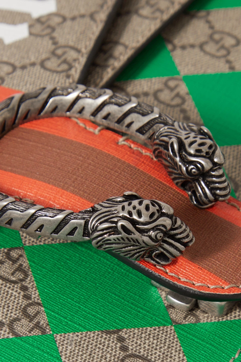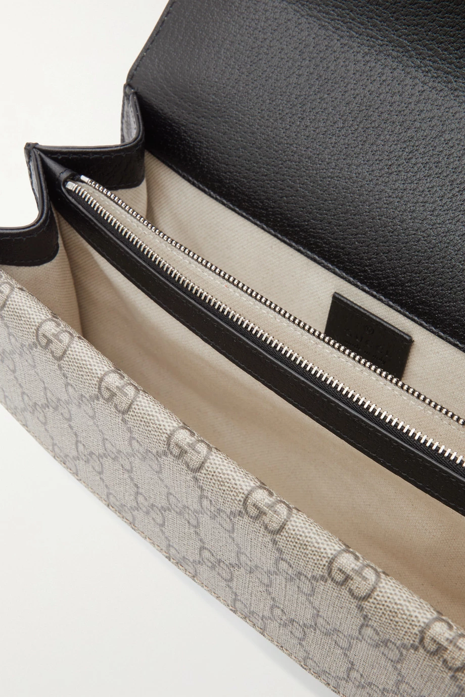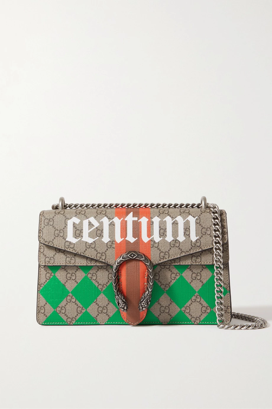 Mit seiner Kollektion für F/S 2022 zollt Alessandro Michele dem traditionsreichen Modehaus Gucci den ihm gebührenden Respekt – als Verweis auf die hundert Jahre, die seit der Markengründung vergangen sind, ist diese Version der immer noch beliebten „Dionysus“ Tasche mit dem Wort „Centum“ bedruckt. Zudem zeigt sich das Modell aus beschichtetem Canvas und schwarzem strukturiertem Leder mit Akzenten in den labeltypischen Farben Grün und Rot. Im Inneren befinden sich mehrere Fächer.
