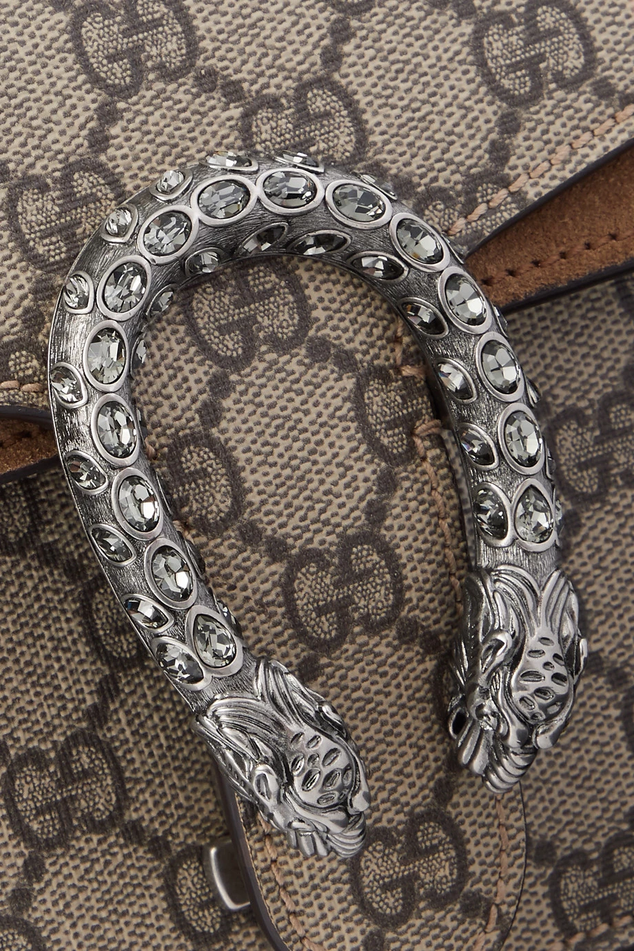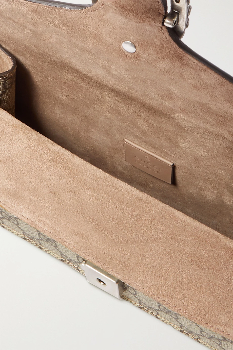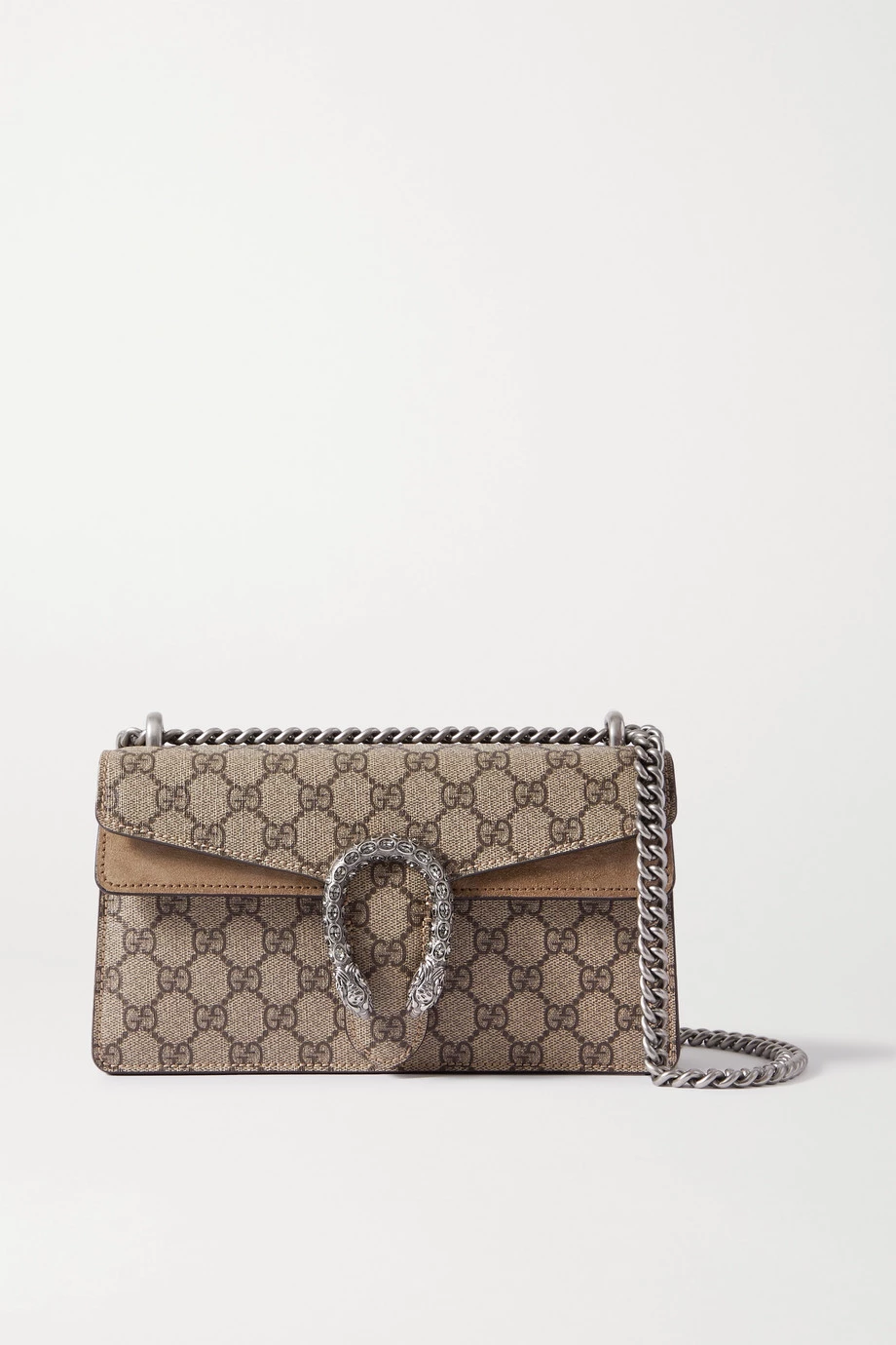 Die „Dionysus“ Schultertasche von Gucci hat einen patinierten silberfarbenen Verschluss, der mit Tigerköpfen verziert ist – die Marke ließ sich für das Detail von der griechischen Mythologie inspirieren. Das Modell aus beschichtetem Canvas zeichnet sich zudem durch ein Muster aus dem Monogramm des Hauses und Velourslederbesätze aus. Dank des verstellbaren Kettenriemens lässt es sich auf verschiedene Arten tragen.