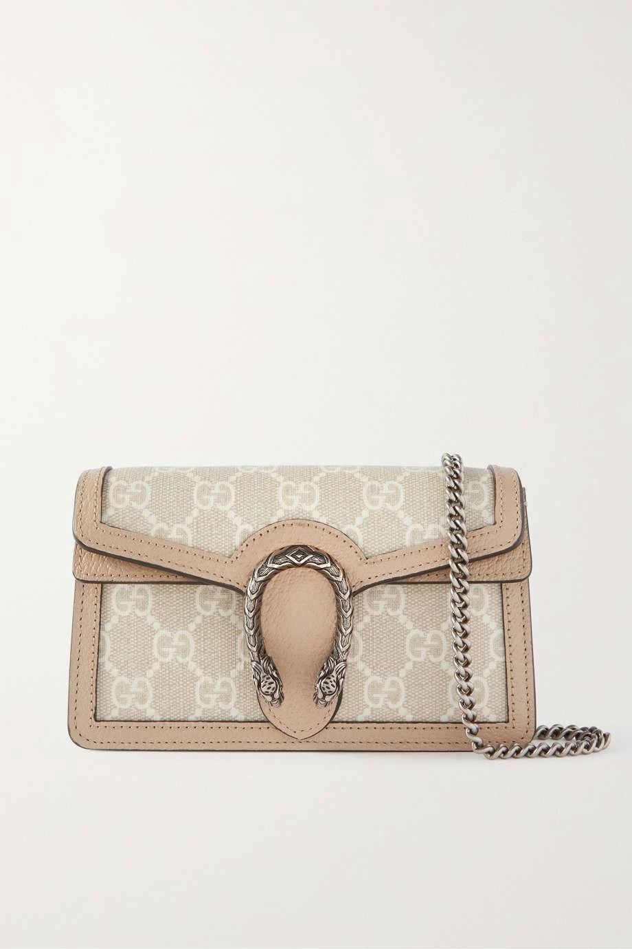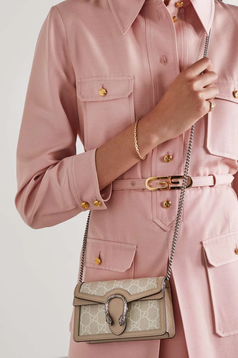 Diese besonders kleine Miniversion der „Dionysus“ Schultertasche von Gucci zeigt sich mit silberglänzenden Details und hat am Verschluss Tigerkopfmotive, für welche die griechische Mythologie als Inspiration diente. Das formstabile Modell aus dem markentypischen beschichteten Canvas mit Monogrammmuster wurde neben Lederbesätzen auch mit einem verstellbaren Kettenriemen gestaltet. Es bietet ausreichend Platz für Smartphone, Portemonnaie und Schlüssel.