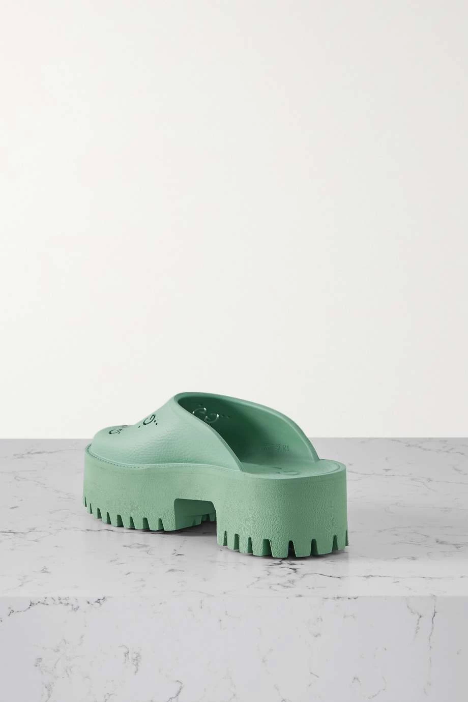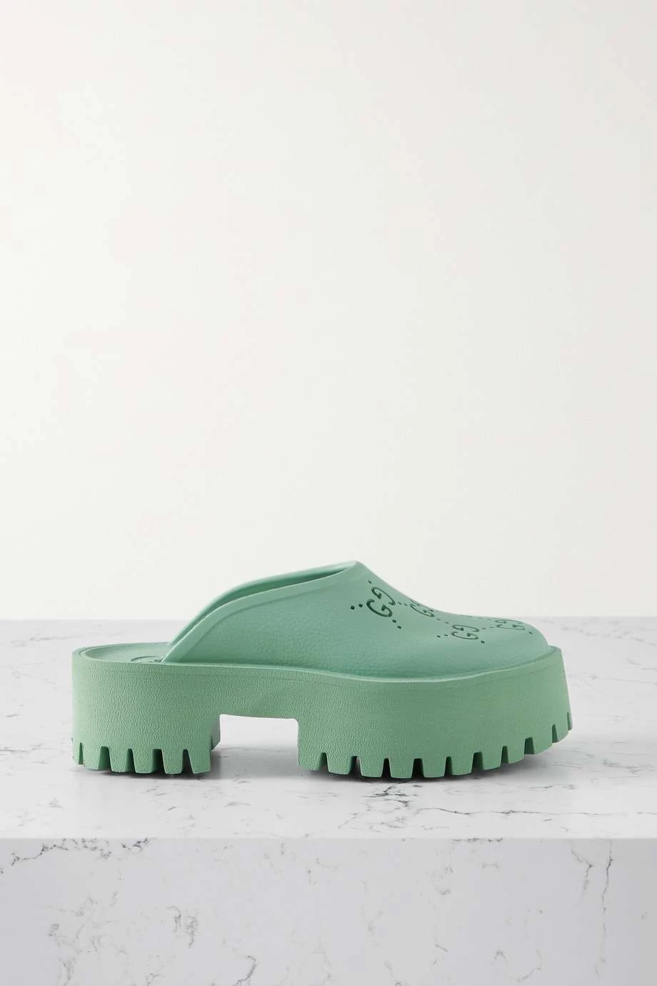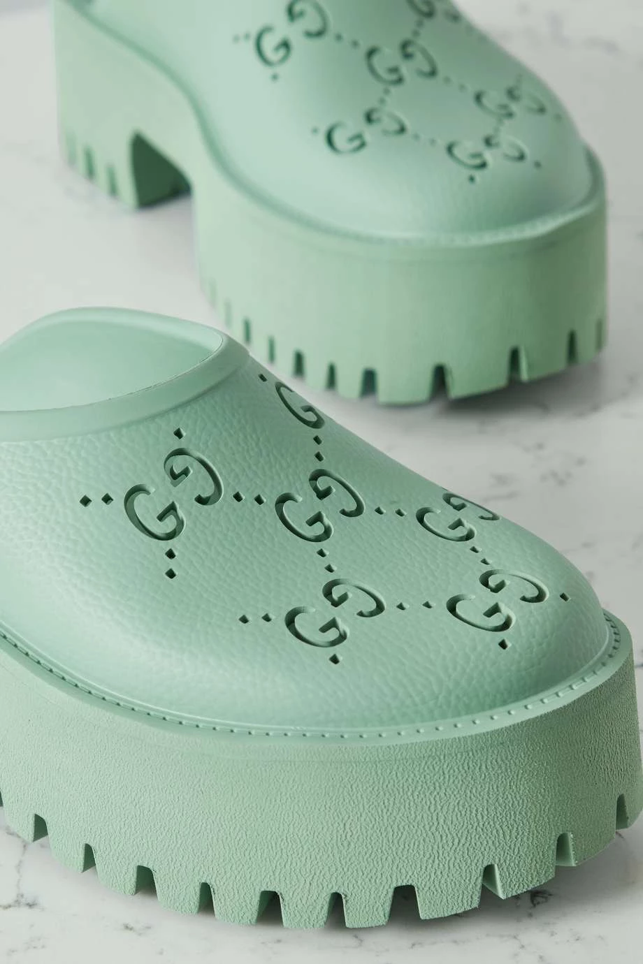 Diese Mules von Gucci zählen zu unseren besonderen Empfehlungen für den Sommer – da das Paar mit Plateau äußerst vielseitig ist, werden Sie es mit Sicherheit häufig tragen. Es besteht aus Gummi, das dank der Struktur wie Leder wirkt und sich mit Perforationen in Form des „GG“-Logos zeigt. Werfen Sie auch einen Blick auf die anderen Farben in unserer Auswahl.