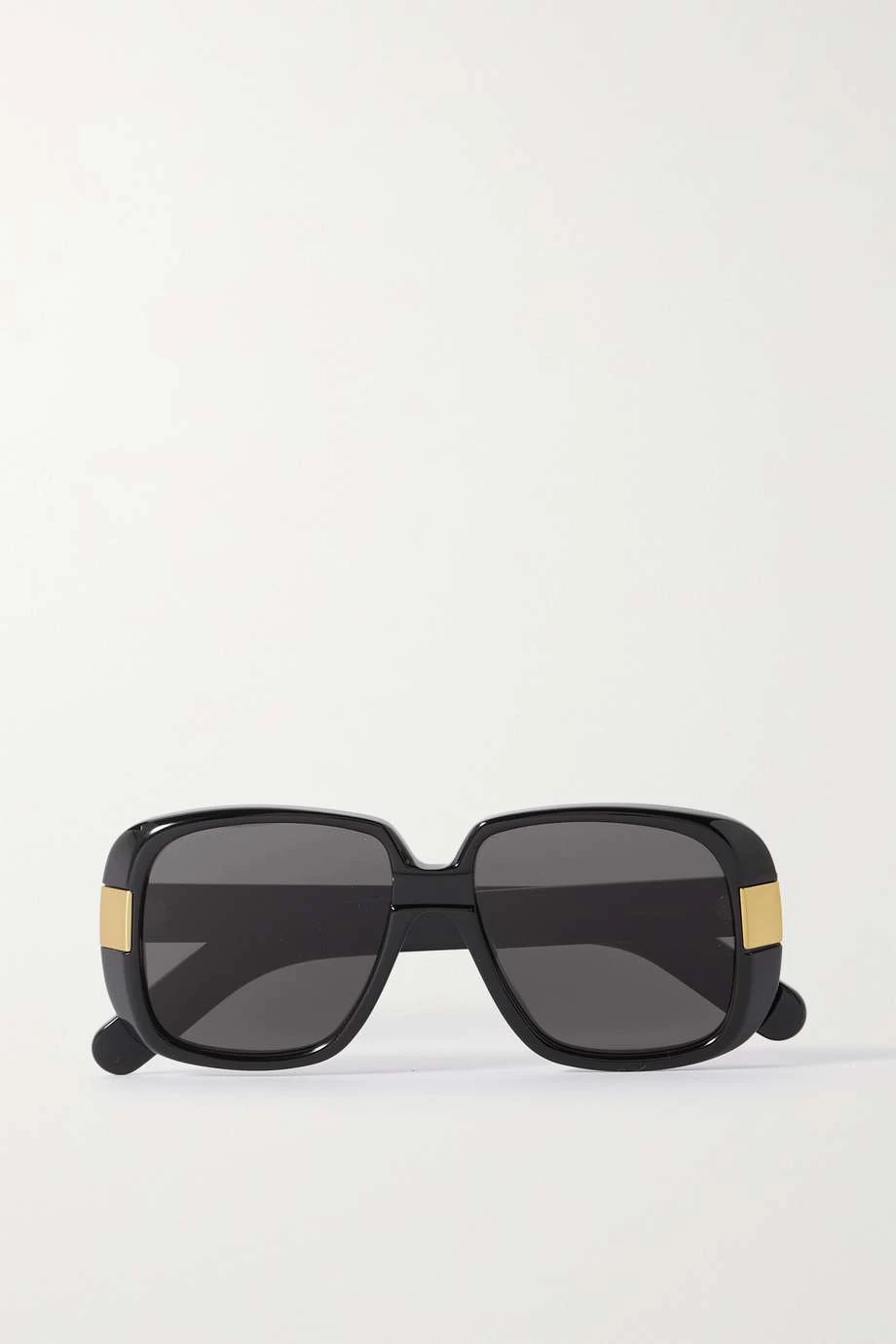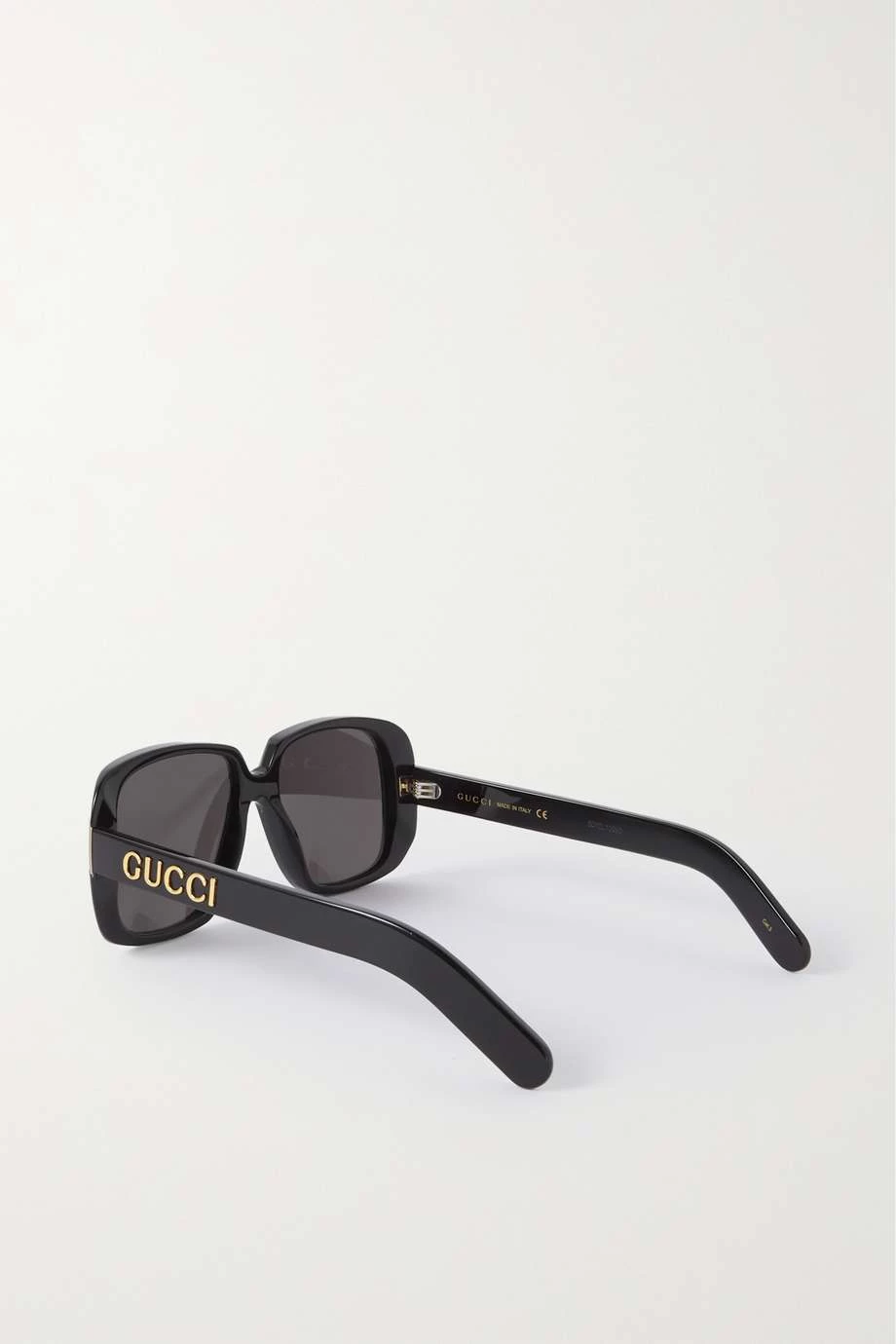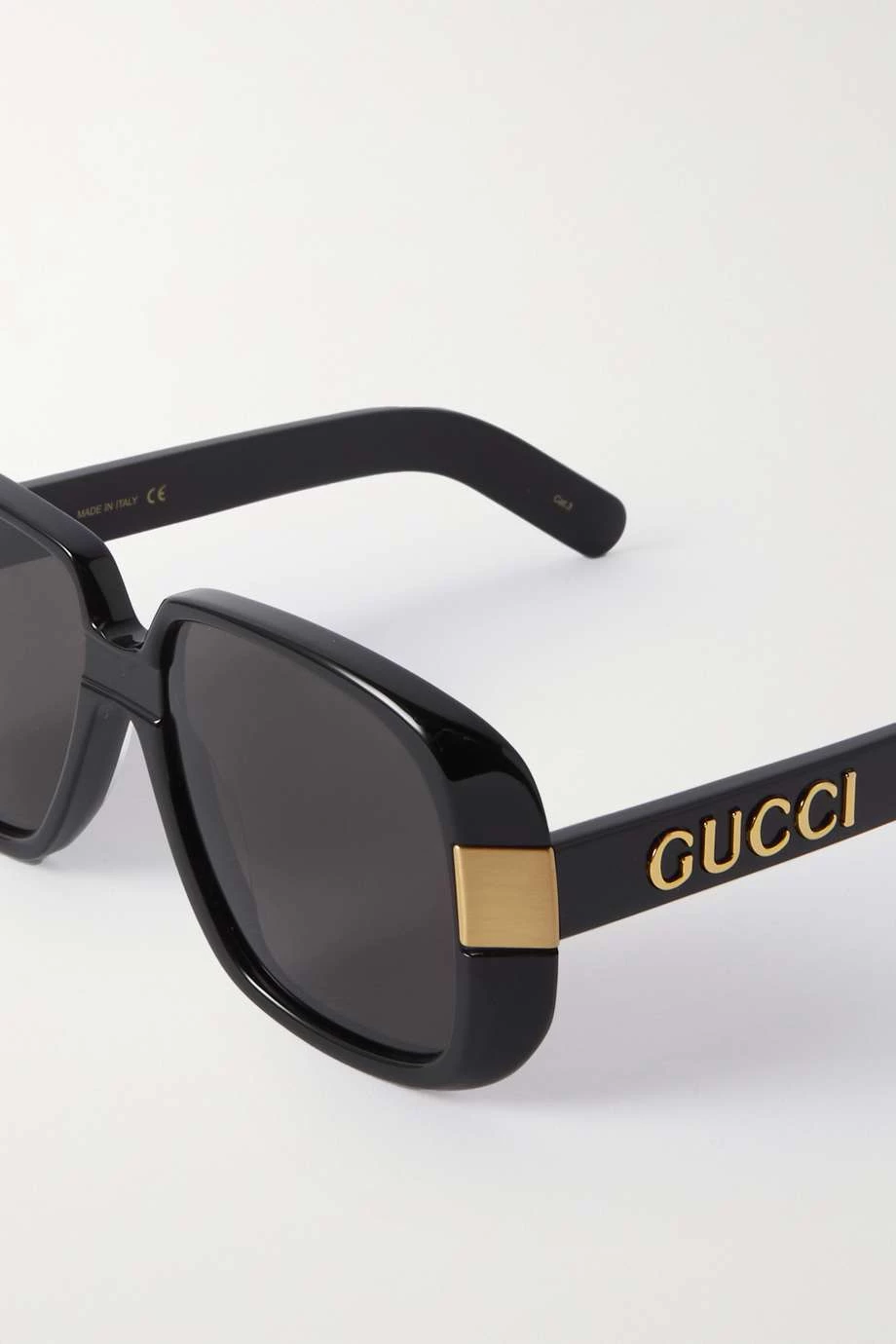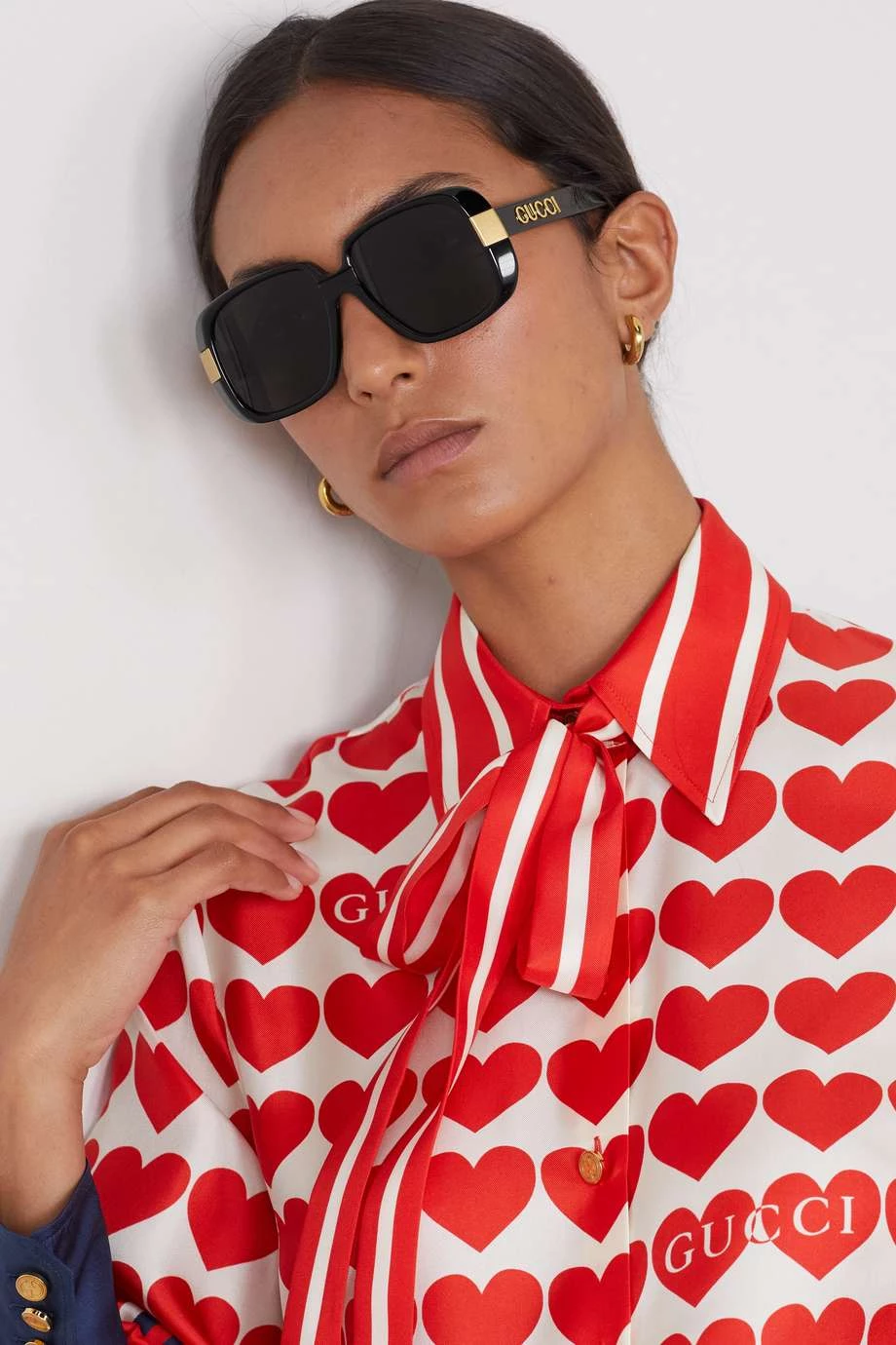 Die „Fashion Show“ Sonnenbrille von Gucci Eyewear verleiht Outfits dank des eckigen Oversized-Rahmens eine auffallende Note. Das in Italien gefertigte Accessoire zeigt sich mit goldfarbenen Elementen und dem Markenlogo an den Bügeln – die Liebe zum Detail ist typisch für das Haus.