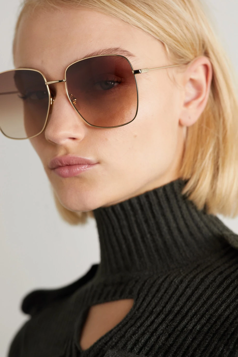 Diese Brille von Gucci Eyewear verleiht schlichten Outfits dank des Oversized-Rahmens elegantes Flair. Das Accessoire besteht aus goldfarbenem Metall und hat braune Gläser. Befestigen Sie die „GG“-Anhänger aus Azetat in Hornoptik an den Bügelenden – sie reichen bis zum Kiefer.