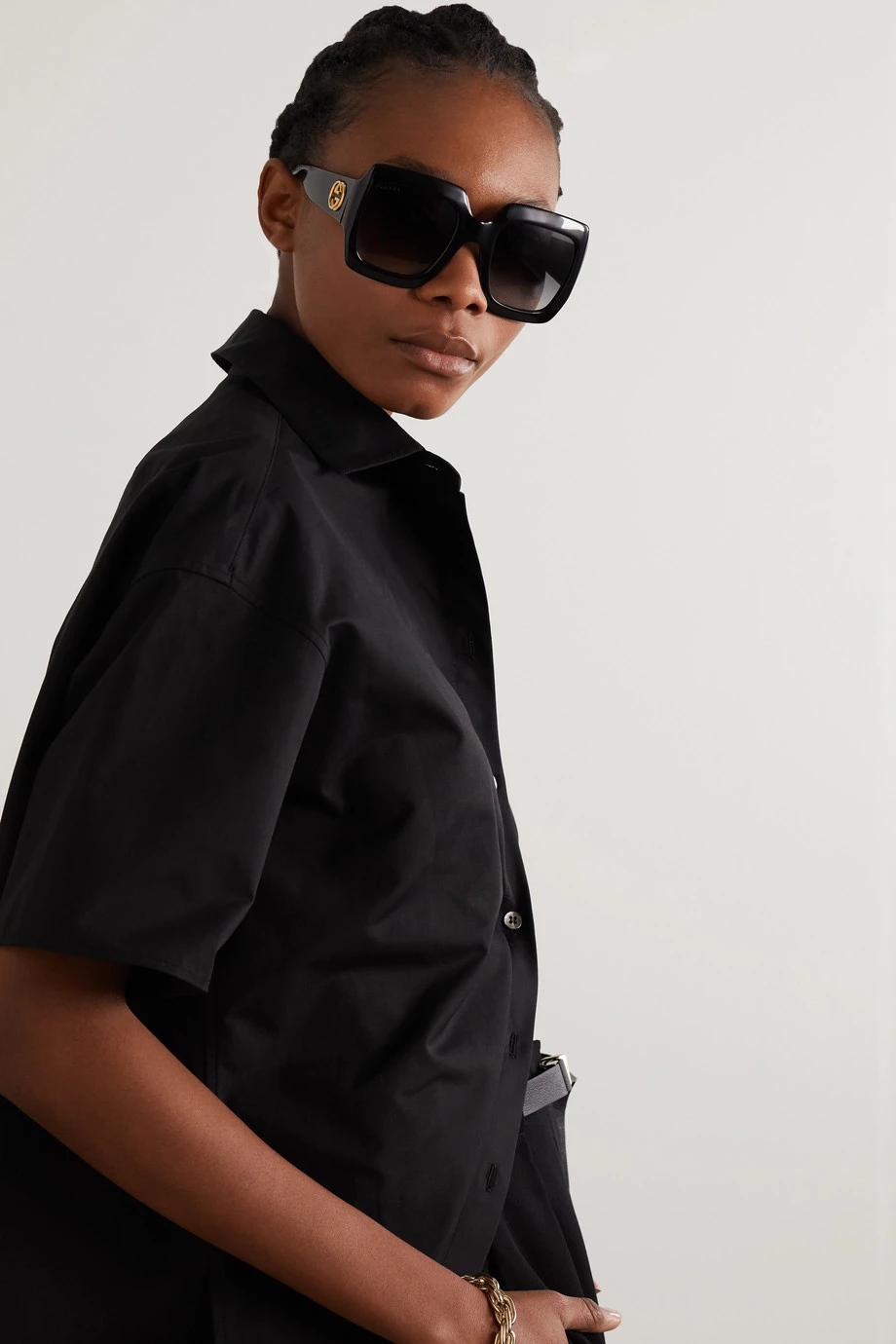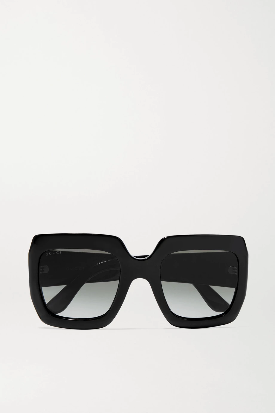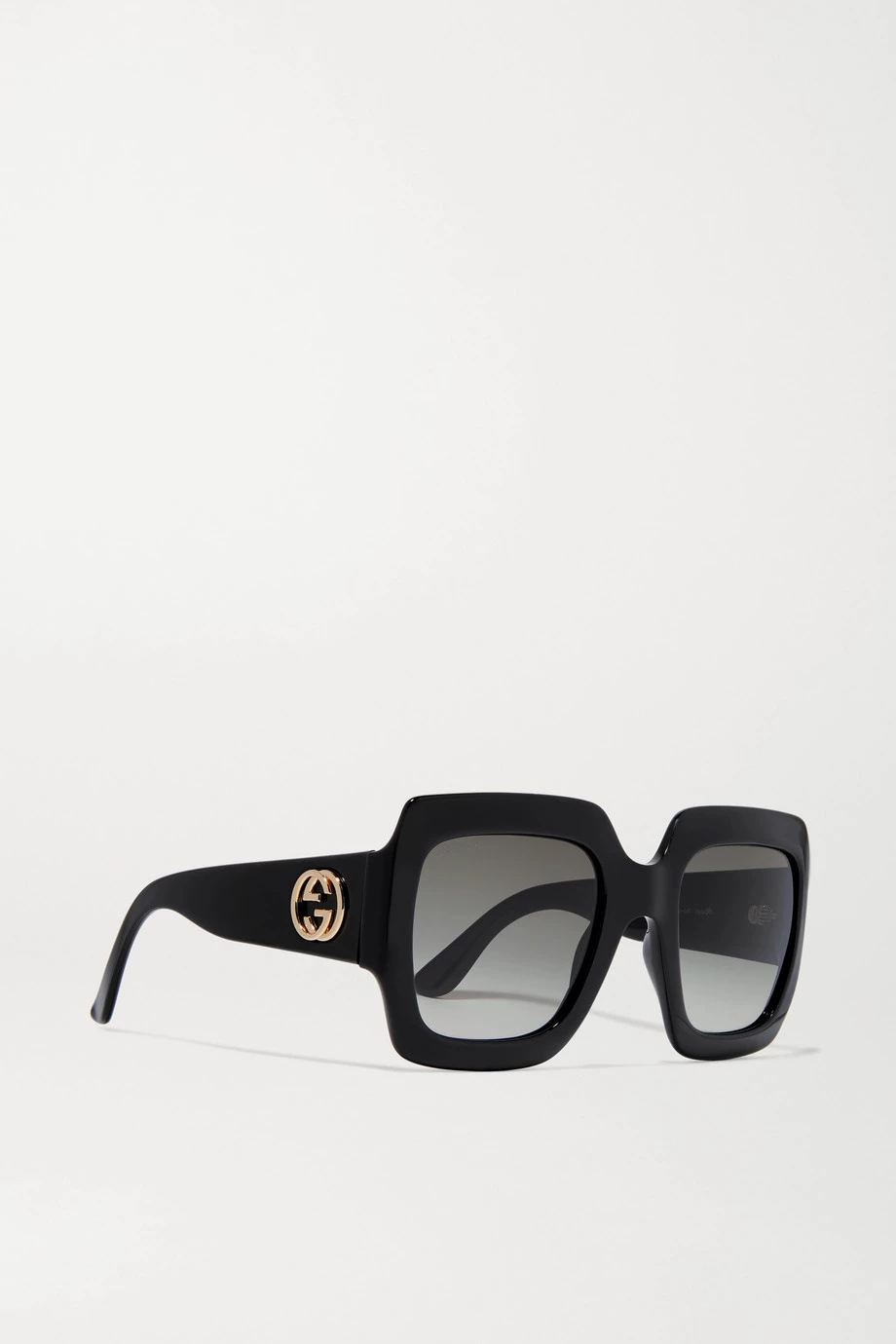 Die „Pop Web“ Statement-Sonnenbrille von Gucci hat sich schnell zu einem Bestseller des Labels entwickelt. Das Oversized-Modell wurde in Italien aus schwarzem Azetat gefertigt und hat einen markanten eckigen Rahmen. An den Bügeln findet sich ein großes „GG“-Logo in Gold.