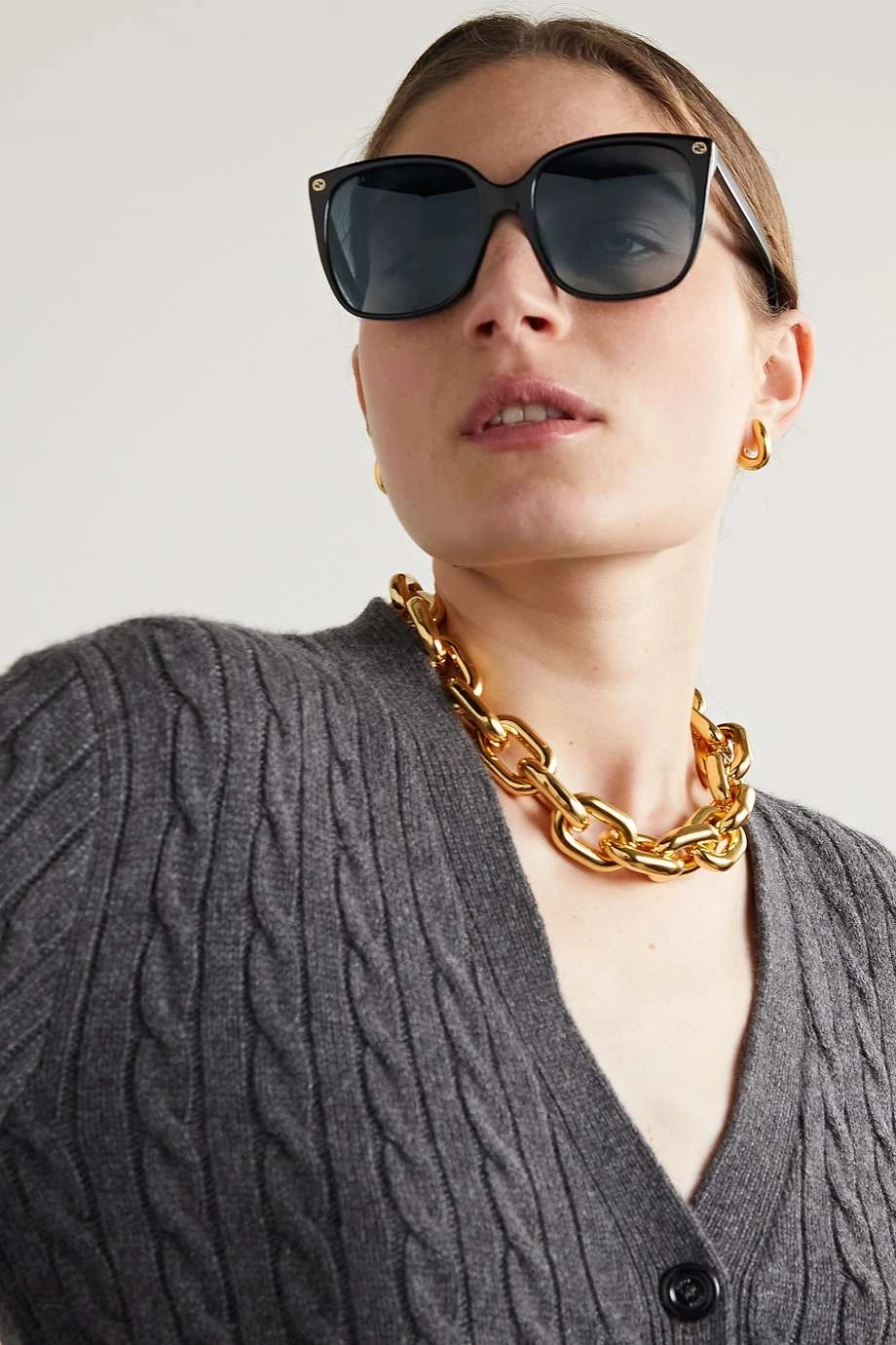 Diese Sonnenbrille von Gucci Eyewear wurde in Italien aus glänzendem schwarzem Azetat in einer D-Form gefertigt, die sich durch weichere, rundere Kanten auszeichnet. Das Accessoire ist zudem mit grauen Gläsern ausgestattet und an den Schläfen mit dem „GG“-Logo und den Bügelenden mit der ikonischen Biene verziert.