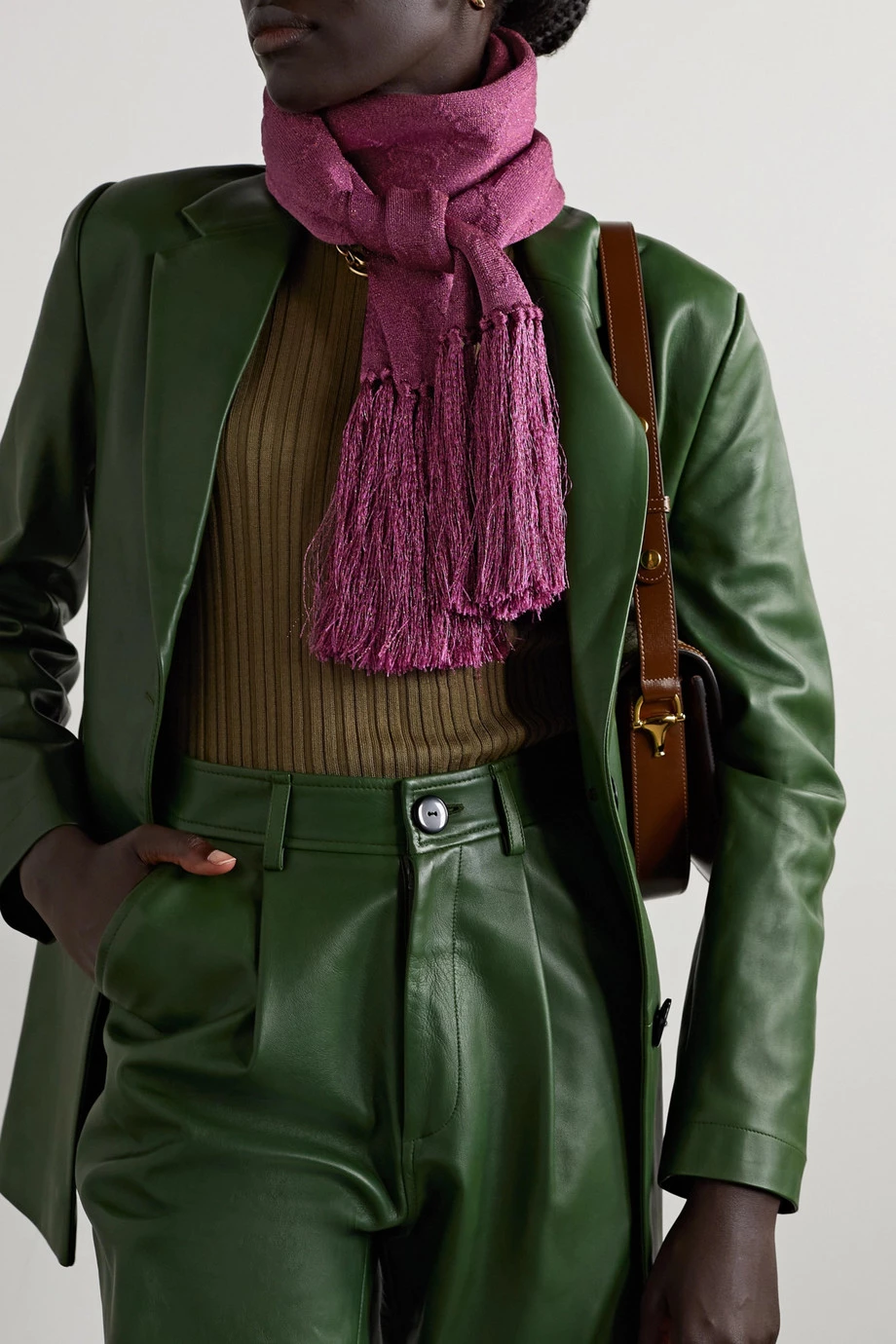 Für die „Ouverture“ Kollektion von Gucci entwarf Alessandro Michele Designs, mit denen Sie die eigene Persönlichkeit zum Ausdruck bringen können. Der in Italien gefertigte „Fittizio“ Schal aus schimmerndem fuchsiafarbenem Lamé zeigt sich mit einem dezenten Jacquard-Muster aus dem „GG“-Logo der Marke sowie Fransen an den Enden. Verleihen Sie damit Mänteln in Beige oder Erdtönen eine fröhliche Note.