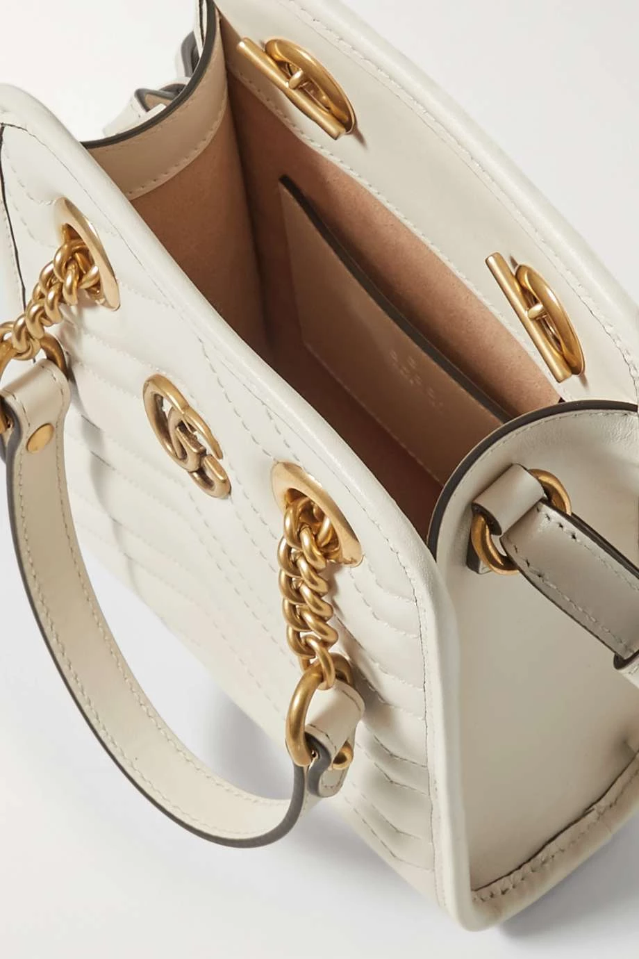 Die formstabile „GG Marmont 2.0“ Schultertasche in Minigröße von Gucci erinnert an Varianten aus den 90er-Jahren. Das Modell besteht aus Leder mit gestepptem Zickzackmuster und hat, typisch für die Marke, markante goldfarbene Details in Vintage-Optik.