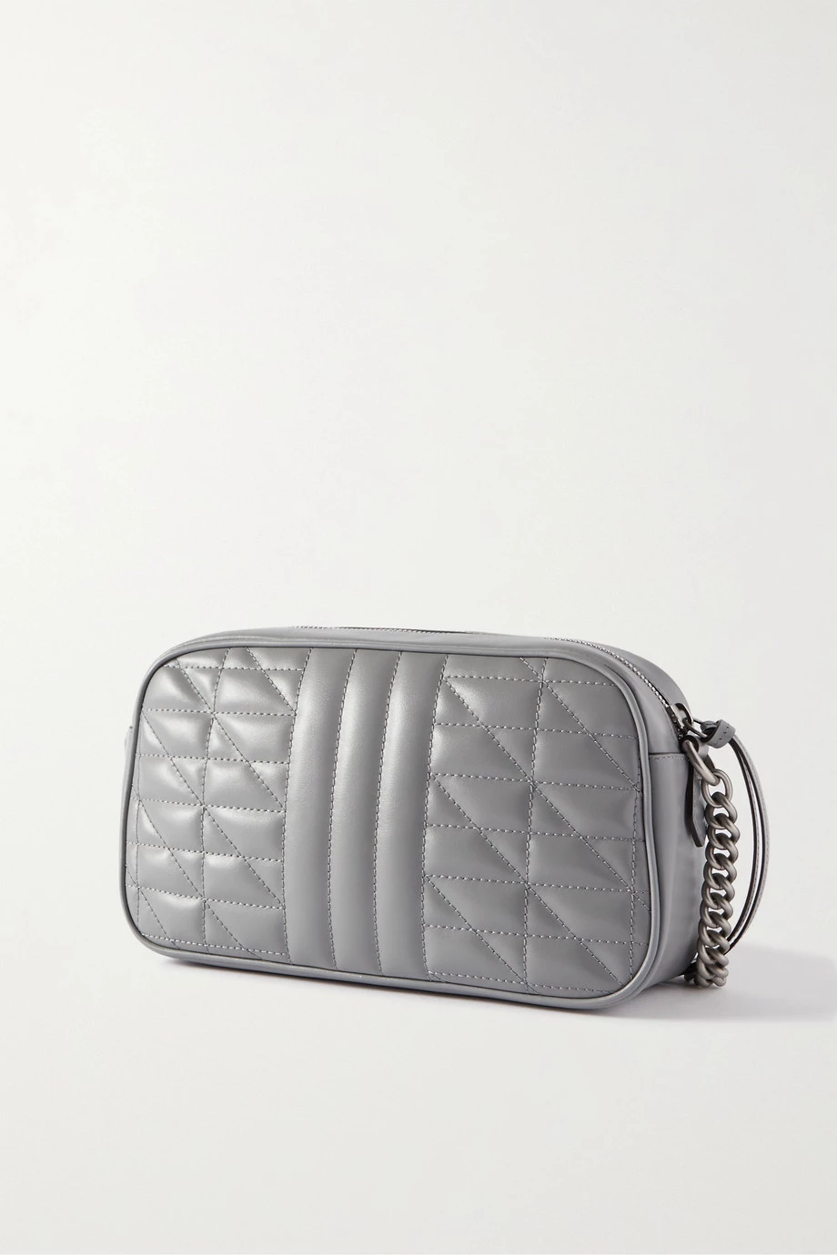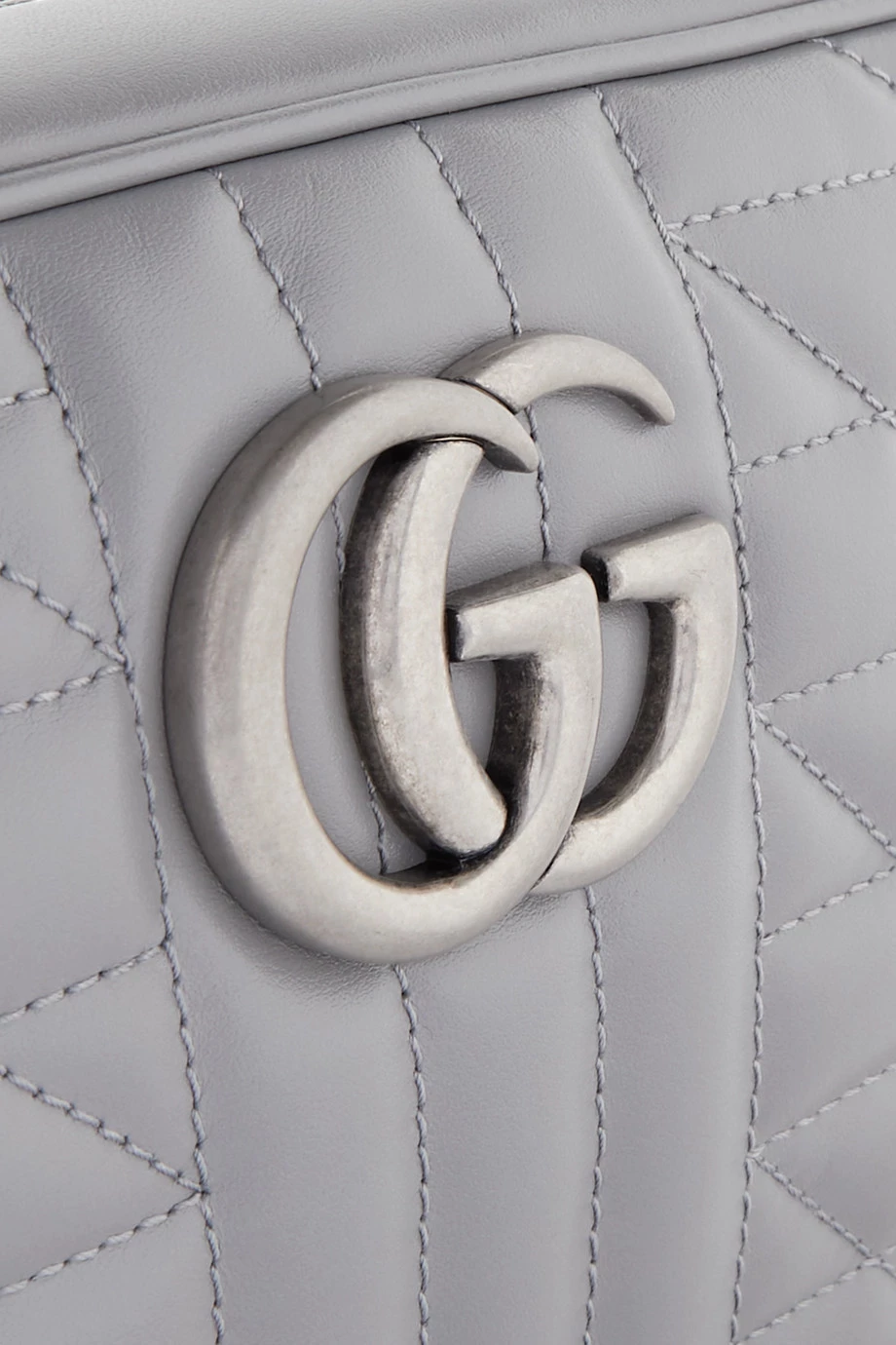 Diese überarbeitete Version der „GG Marmont Camera“ Tasche von Gucci zeigt sich mit einem Steppmuster aus geometrischen Formen. Überdies hat das in Italien gefertigte Ledermodell einen patinierten silberglänzenden Kettenträger und ein „GG“-Detail, das auf einer Variante des Hauses aus den 70er-Jahren basiert. Im Inneren finden Essentials wie Kartenetui und Lippenstift Platz.