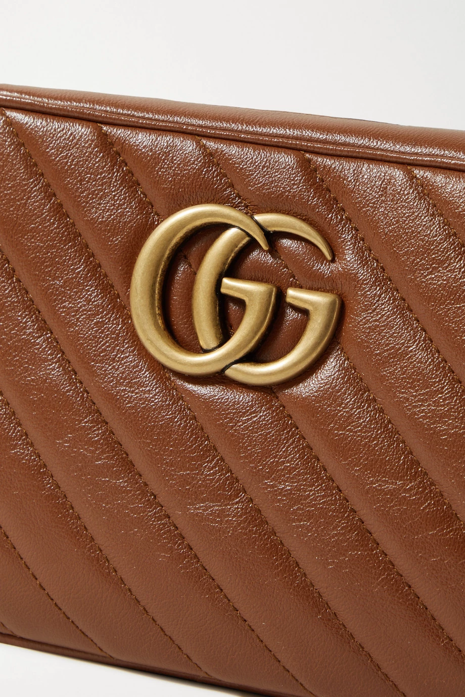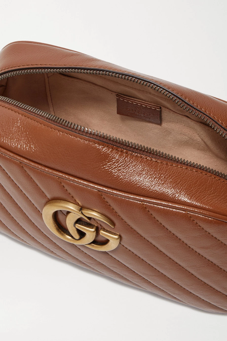 Als Inspiration für das kompakte „GG Marmont“ Modell von Gucci dienten Kamerataschen im Vintage-Stil. Das Accessoire in vielseitigem Hellbraun wurde in Italien aus Leder mit dem markentypischen Zickzackmuster gefertigt und bietet genügend Platz für kleinere Alltagsgegenstände. Wie auch die „GG“-Logoapplikation an der Vorderseite zeigen sich die goldfarbenen Kettendetails am Träger mit brüniertem Finish.