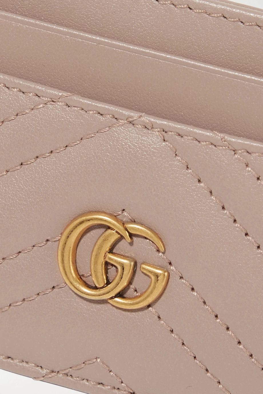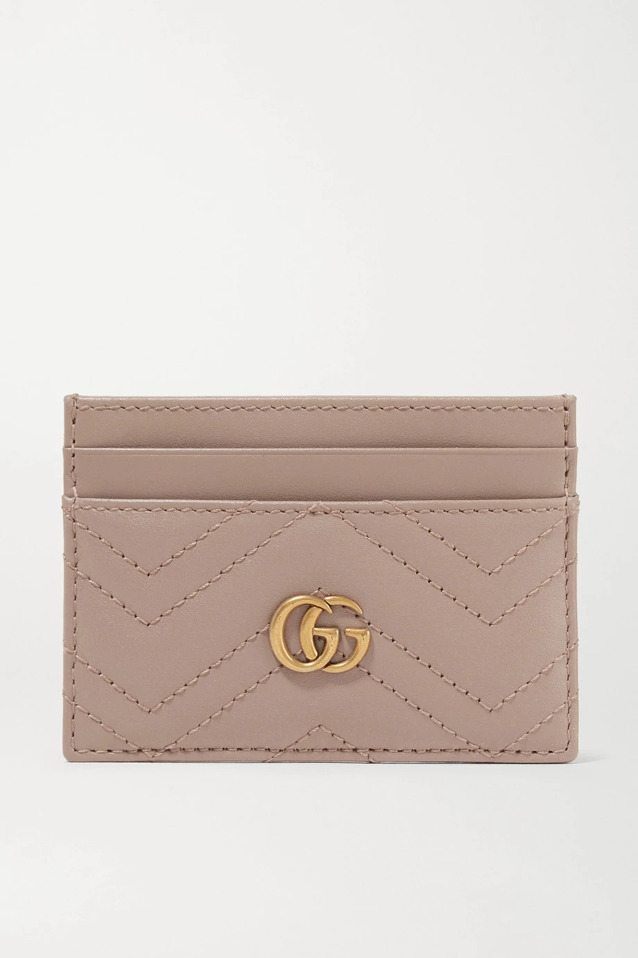 Dieses Kartenetui von Gucci ist mit dem goldfarbenen „GG“-Logo des Hauses verziert, das aus den 70er-Jahren stammt. Das in Italien gefertigte Modell aus altrosafarbenem Leder wurde mit Zickzacknähten versehen und verfügt über vier Kartenschlitze sowie ein Fach für Quittungen und Geldscheine. Bewahren Sie es in der passenden Schultertasche auf.