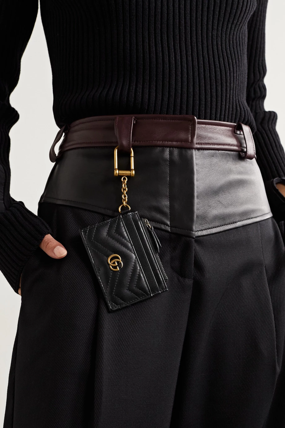 Das kompakte „GG Marmont“ Kartenetui von Gucci ist eine stylishe und leichte Alternative zu einem Portemonnaie – es bietet gerade genug Platz für Ihren Ausweis, die wichtigsten Karten und ein paar Münzen. Das in Italien gefertigte Modell aus schwarzem Leder ist mit zwei Markenzeichen des Hauses verziert: dem winkelförmigen Steppmuster und einem brünierten goldfarbenen Logodetail. Befestigen Sie es an einem Schlüsselring oder einer Tasche.