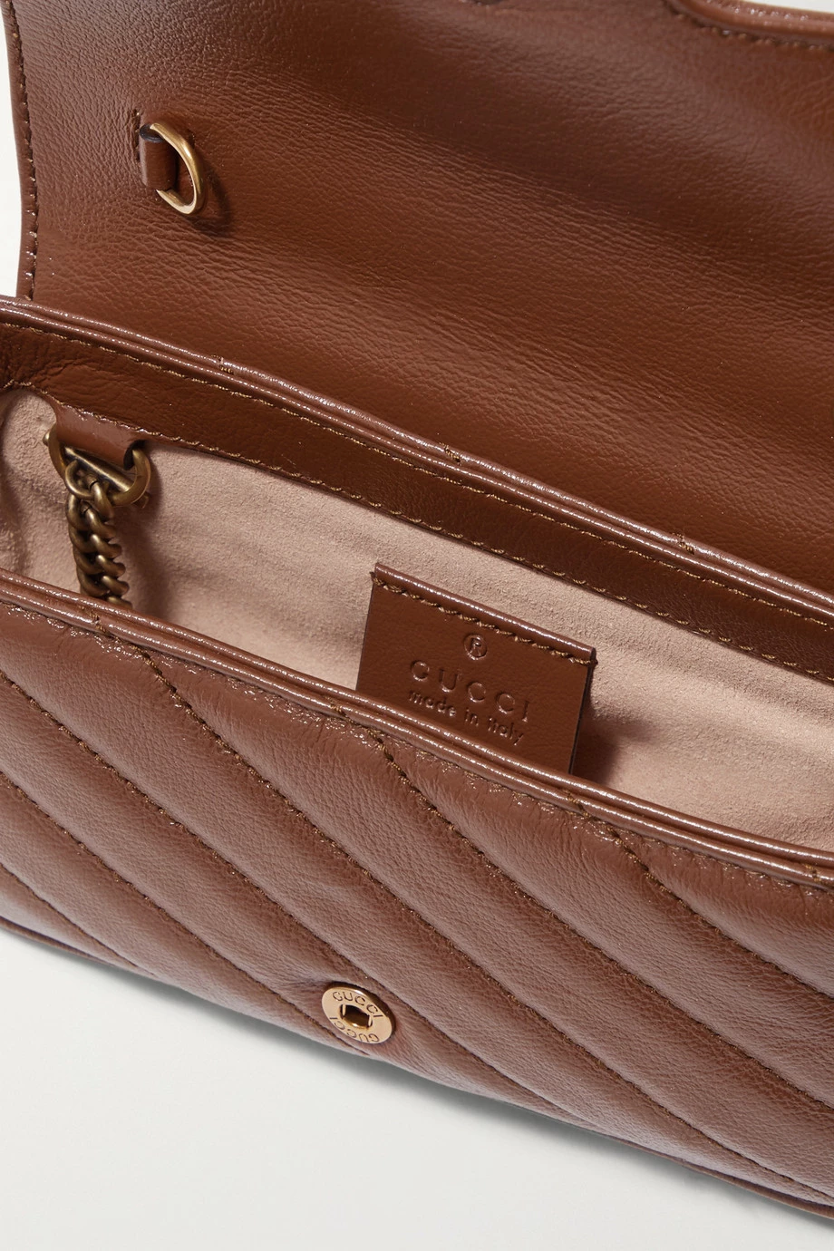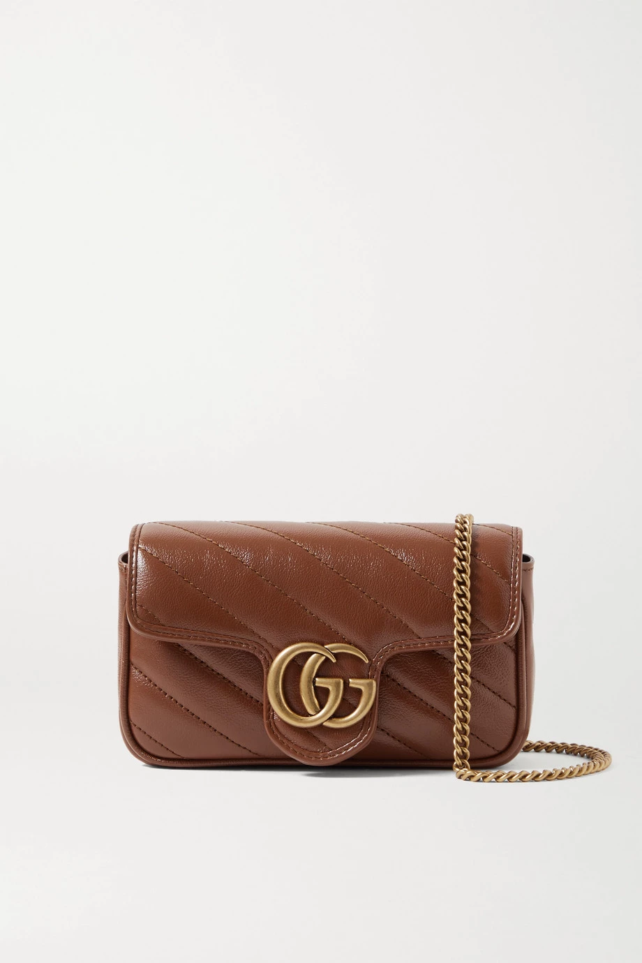 Die passend benannte „super mini“ Tasche ist ein stilvolles Mitglied der „GG Marmont“ Reihe von Gucci und bietet gerade genug Platz für alles Wichtige. Das Modell wurde in Italien aus gestepptem Leder gefertigt und mit der ikonischen goldfarbenen Logoapplikation der Marke versehen. Der verstellbare Kettenriemen kann doppelt genommen über der Schulter getragen werden.