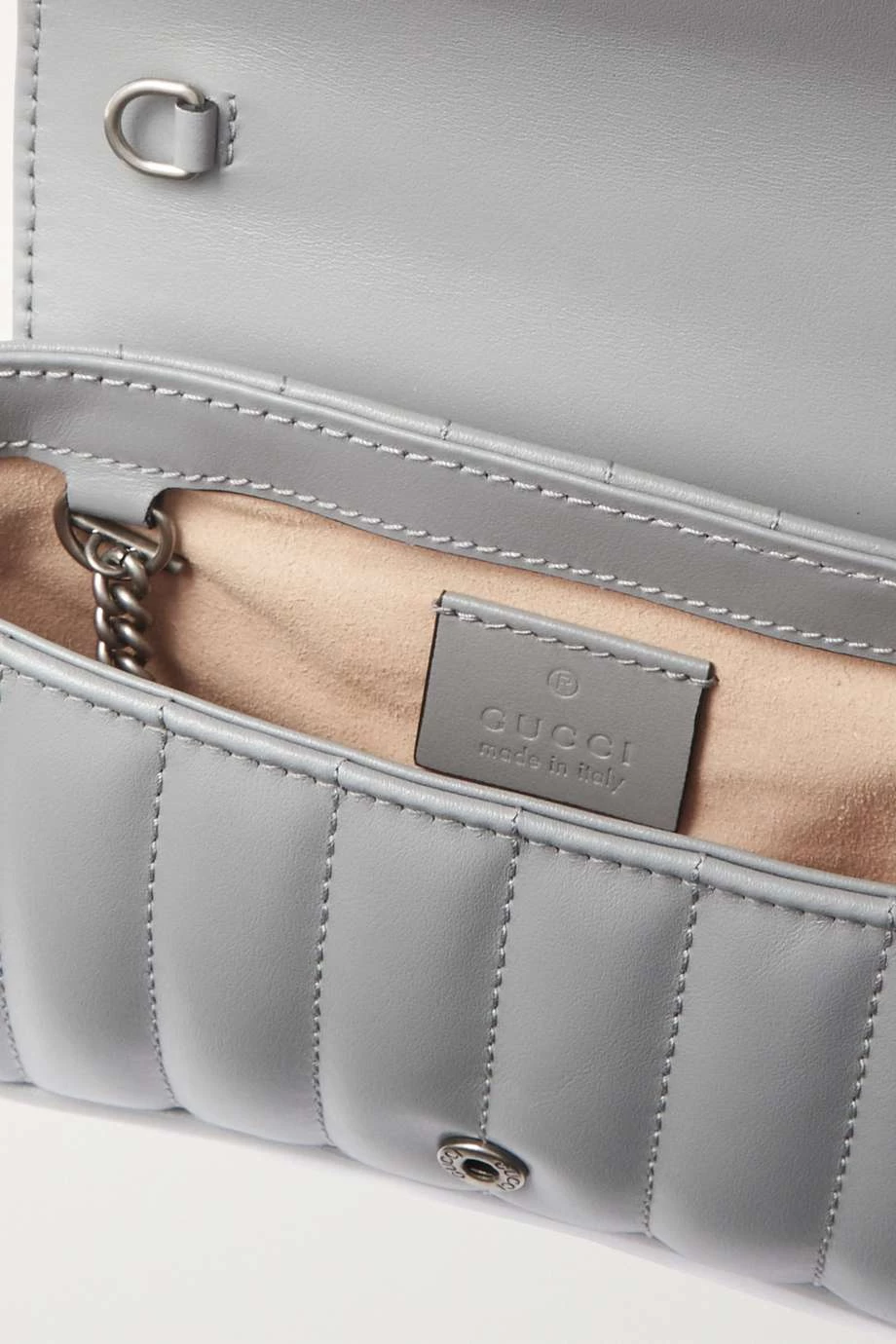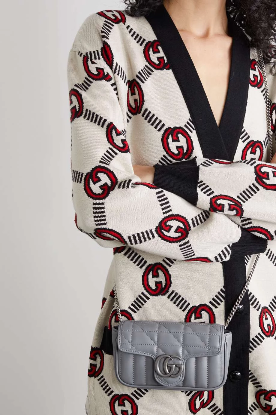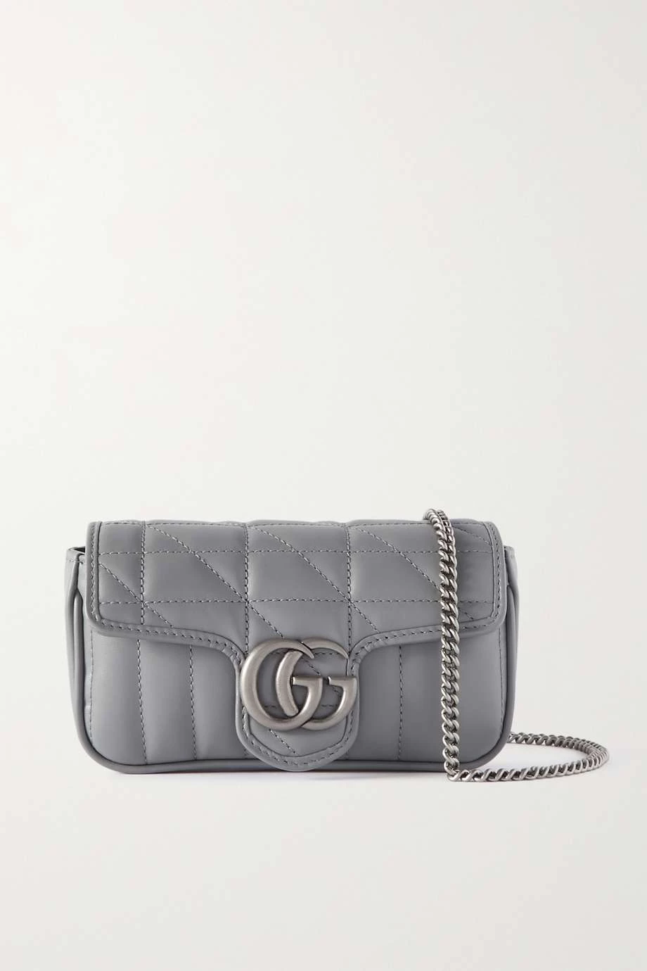 Die passend benannte „super mini“ Tasche ist ein stilvolles Mitglied der „GG Marmont“ Reihe von Gucci und bietet gerade genug Platz für alles Wichtige. Das Modell wurde in Italien aus gestepptem Leder gefertigt und mit der ikonischen Logoapplikation der Marke versehen. Der verstellbare Kettenriemen kann doppelt genommen über der Schulter getragen werden. Stimmen Sie Ihren Schmuck auf die silberglänzenden Details ab.