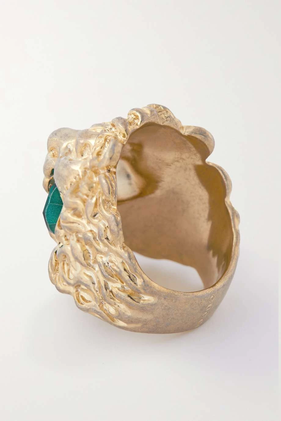 Dieser Ring von Gucci ist ein echtes Statement-Schmuckstück: Das markante Modell in Form eines Löwenkopfes besteht aus goldglänzendem Metall und wurde neben farblosen Kristallen auch mit einem leuchtend grünen Zierstein besetzt. Wir empfehlen Nagellack in einem dezenten Ton dazu.