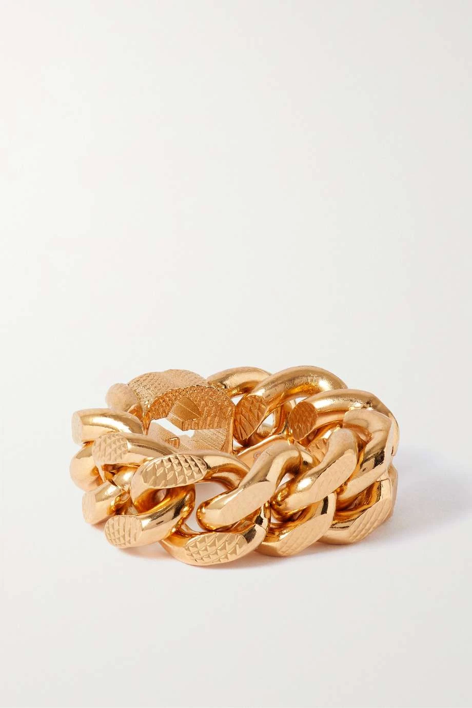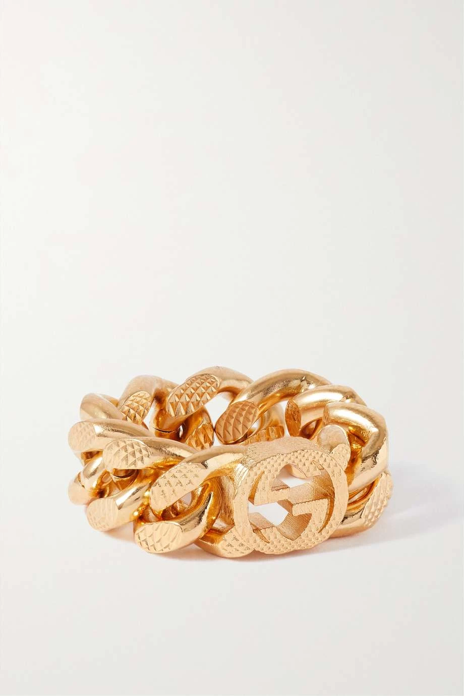 Die „Gourmette“ Gliederkette von Gucci war ursprünglich Teil der „Aria“ Kollektion – in dieser Saison ist sie wieder auf diversen Schmuckstücken und Accessoires, wie diesem Ring, zu sehen. Das Modell wird mit dem charakteristischen „GG“-Logo abgerundet.