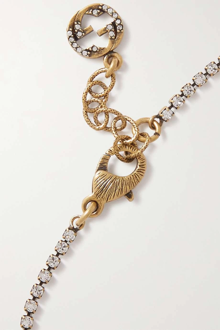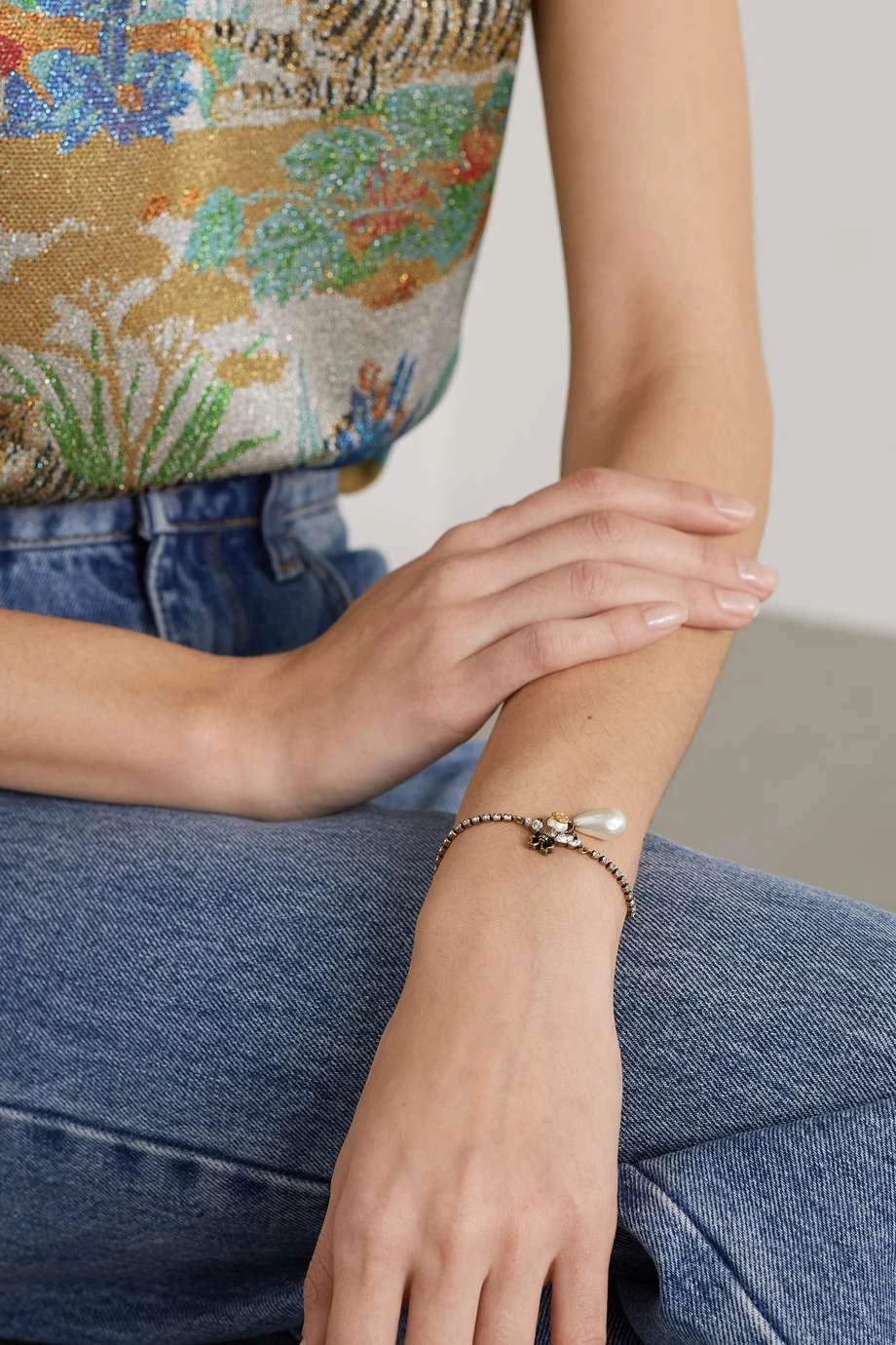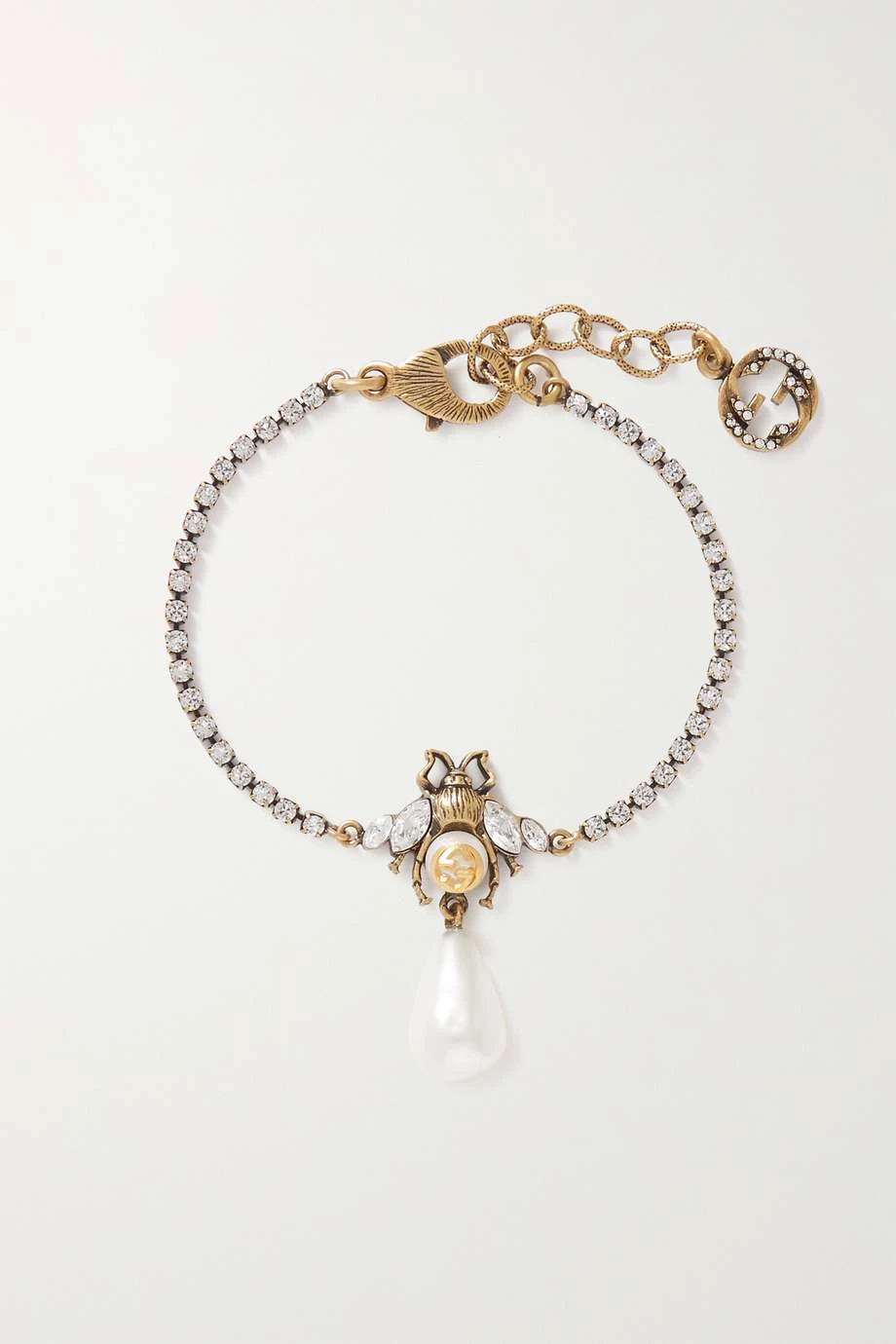 Dieses Armband von Gucci besteht aus goldfarbenem Metall, das dank des brünierten Finishs wie ein Vintage-Modell wirkt. Das Accessoire zeigt sich mit funkelnden Kristallen, der markentypischen Biene und dem kleinen „GG“-Logo. Der Kunstperlenanhänger baumelt dabei sanft bei jeder Handbewegung.