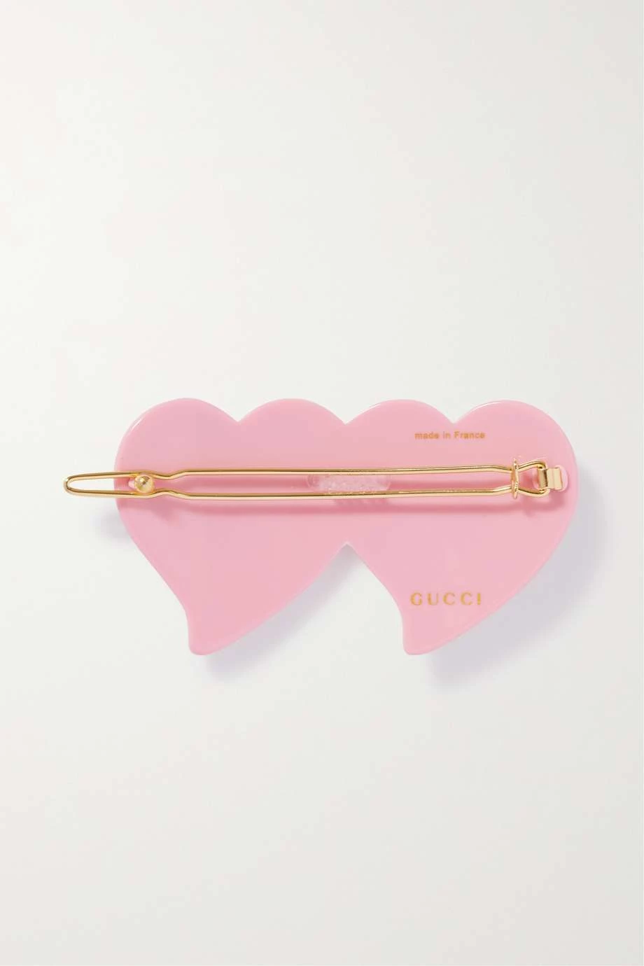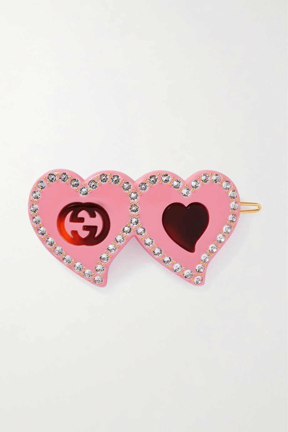 Diese Haarspange von Gucci, die wie zwei Herzen gestaltet ist, gibt Ihrer Frisur eine verspielt romantische Note. Sie besteht aus leichtem hellrosafarbenem Harz und zeigt sich mit dem „GG“-Logo. Die Umrandung bilden funkelnde Kristalle.