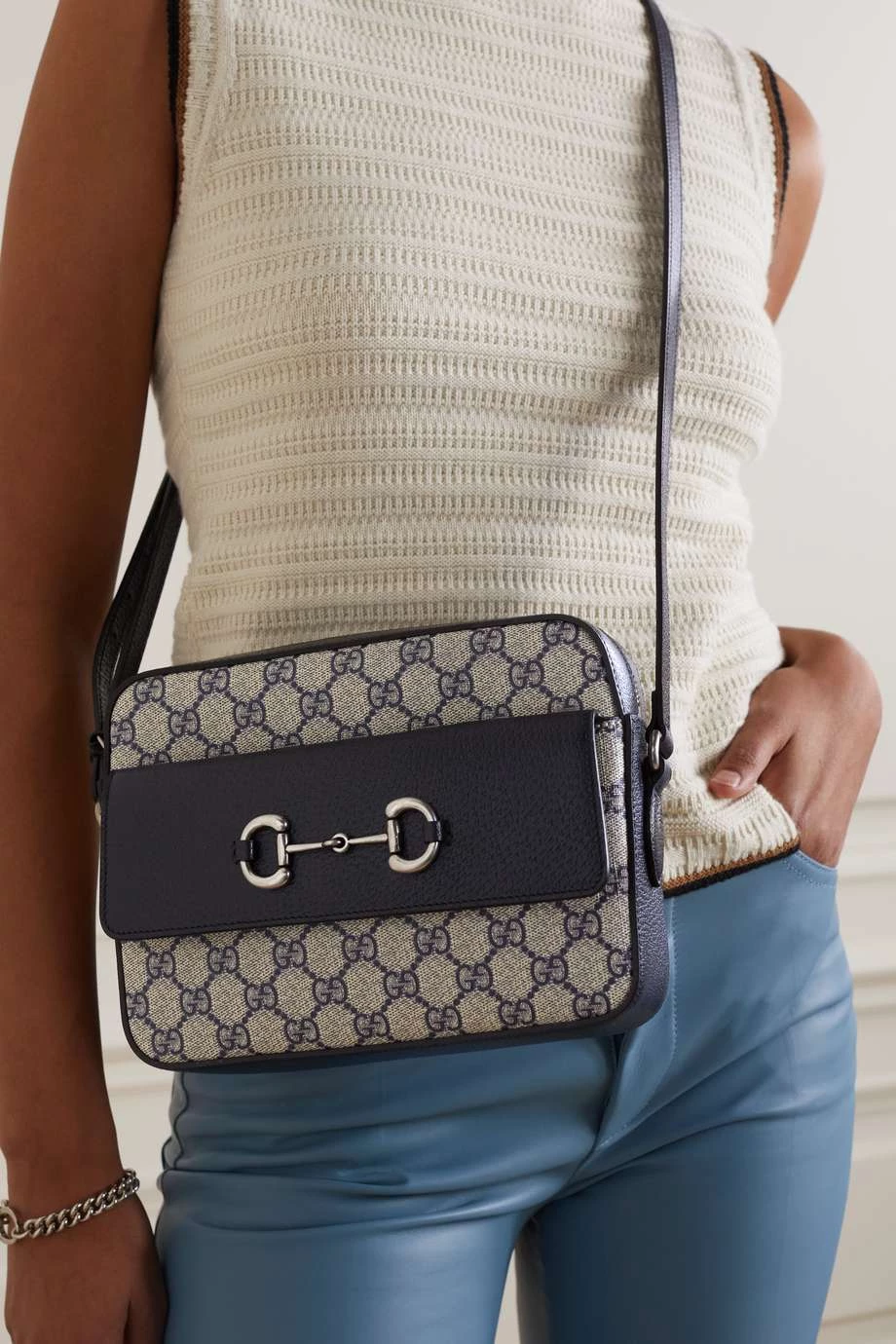 Diese kastenförmige Neuinterpretation der „1955“ Tasche von Gucci weist zwei Markenzeichen des Hauses auf: Das Horsebit-Detail und den charakteristischen Canvas mit „GG Supreme“-Muster des Labels. Das Modell mit Besätzen aus Glattleder wurde in Italien gefertigt und hat eine praktische Pattentasche an der Vorderseite, in der Smartphone oder Schlüssel griffbereit aufbewahrt werden können. Der lange Schulterriemen lässt sich außerdem verstellen.