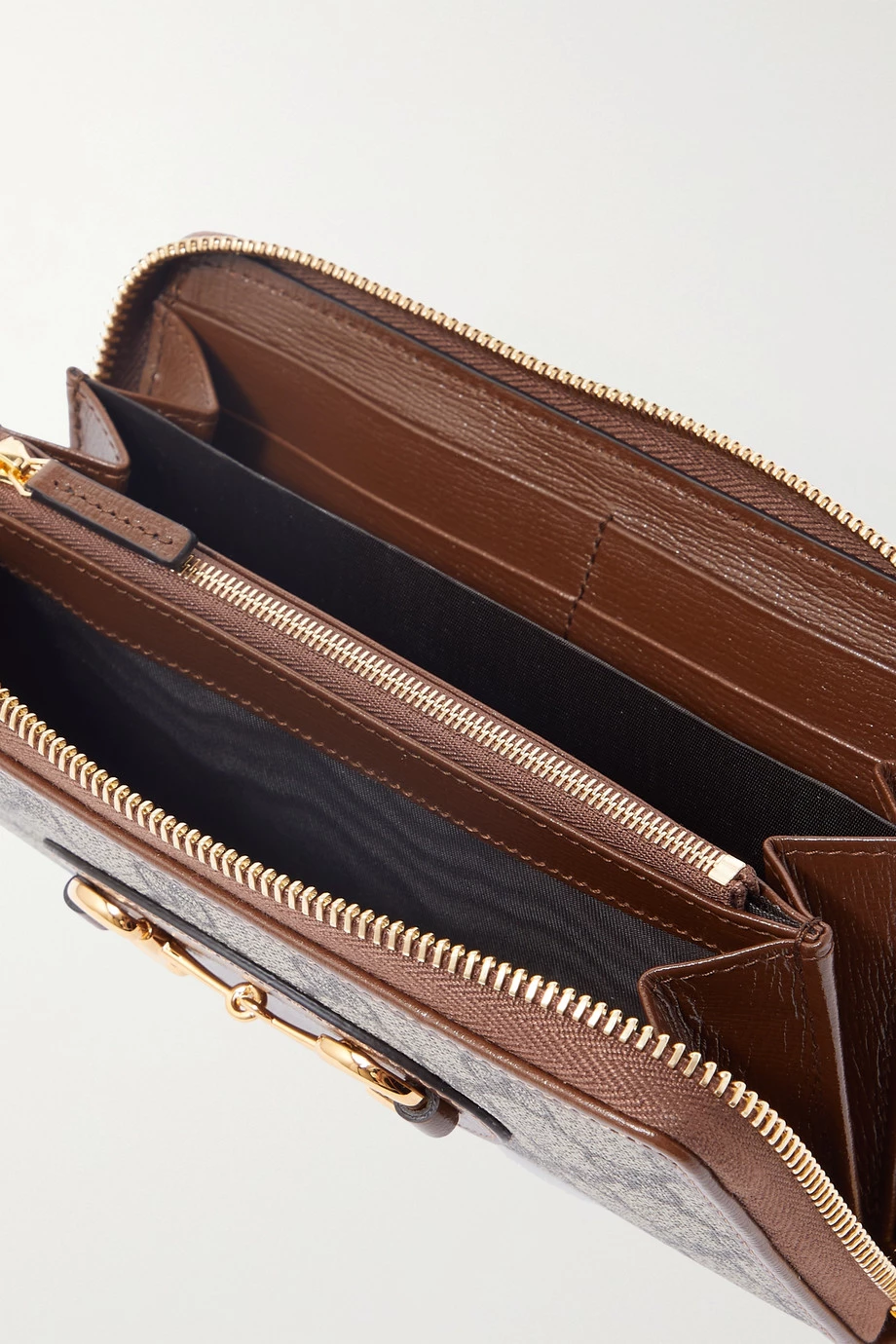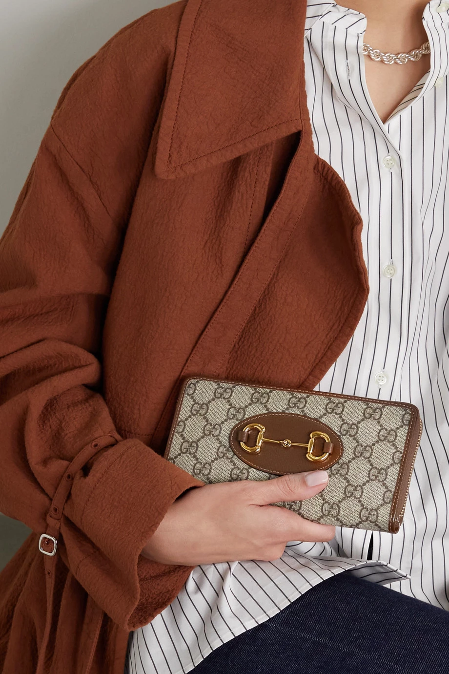 Das „Horsebit 1955“ Portemonnaie von Gucci wurde in Italien aus dem ikonischen beschichteten Canvas mit Logomuster gefertigt und mit robusten Besätzen aus strukturiertem Leder gestaltet. Es hat zwölf Kartenschlitze, eine Reißverschlusstasche für Münzen und drei Fächer für Geldscheine und Quittungen. Verstauen Sie es in der passenden Tote aus unserer Auswahl.