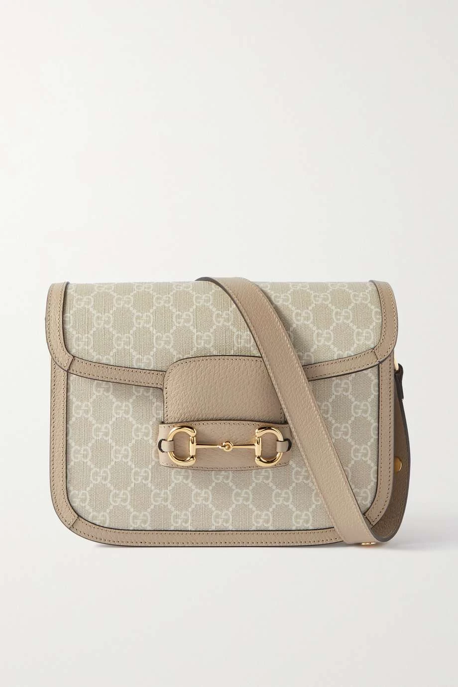 Diese überarbeitete Version der „1955 Horsebit“ Schultertasche von Gucci wurde bereits von Berühmtheiten wie Sienna Miller, Adwoa Aboah und Alexa Chung getragen. Das Accessoire in Form einer Satteltasche wurde in Italien aus beschichtetem Canvas gefertigt, der mit dem charakteristischen Labellogo bedruckt ist, und zeigt sich mit kieselgrauen Lederbesätzen. Stimmen Sie Ihren Schmuck auf das goldfarbenene „Horsebit“-Detail ab.