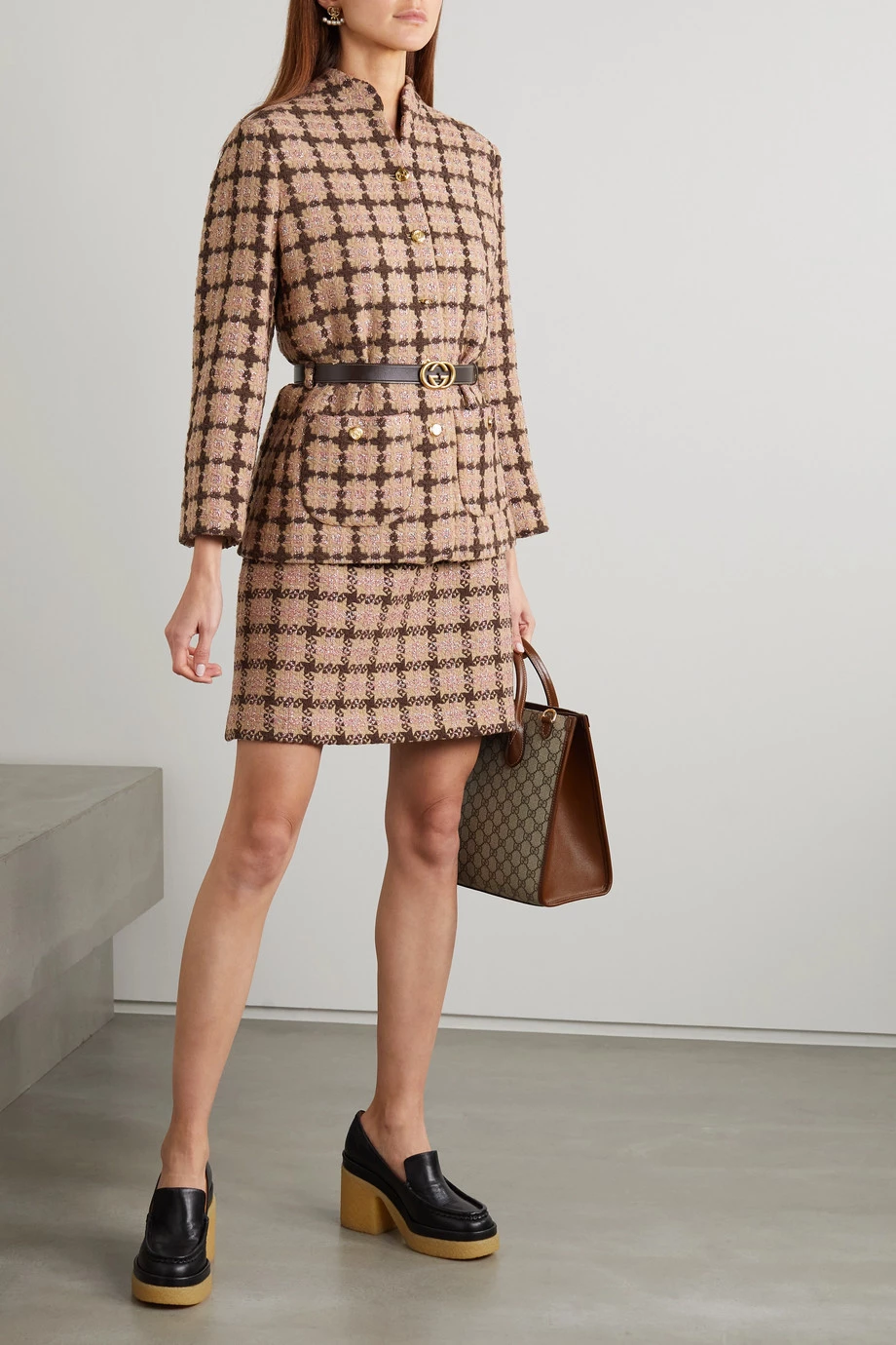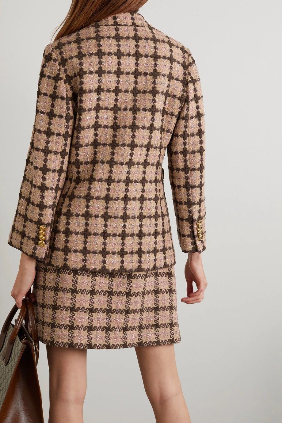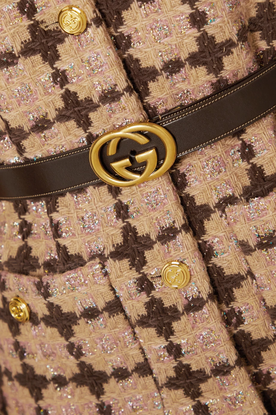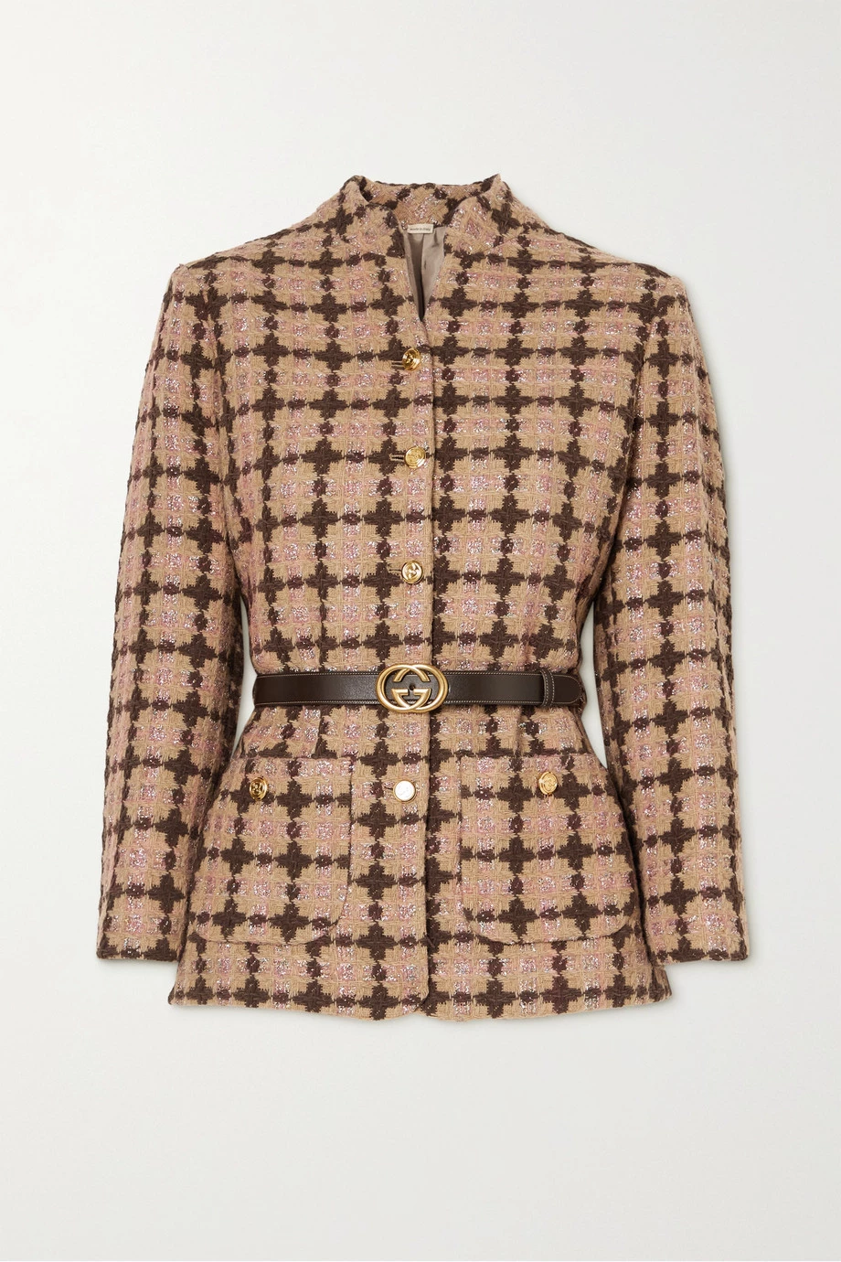 Diese Jacke von Gucci wurde aus kariertem Tweed gefertigt, der dank funkelnder Garne wunderschön glitzert. Das körpernahe Modell zeigt sich mit goldfarbenen Knöpfen mit „GG“-Logo und kann mithilfe des Gürtels tailliert werden.