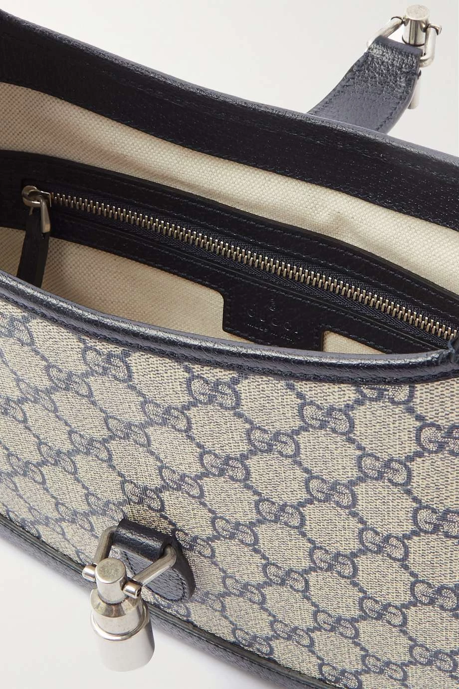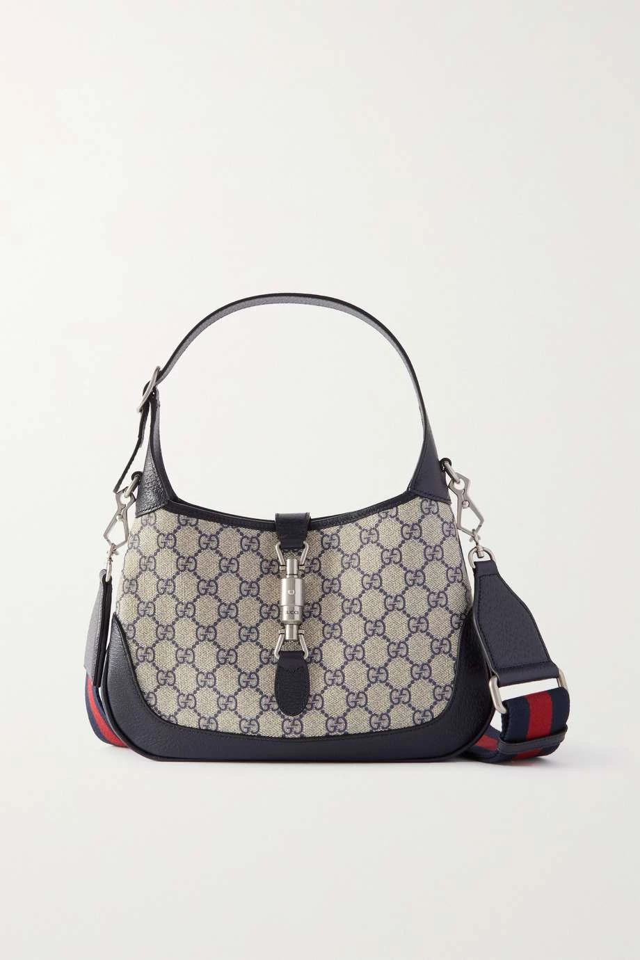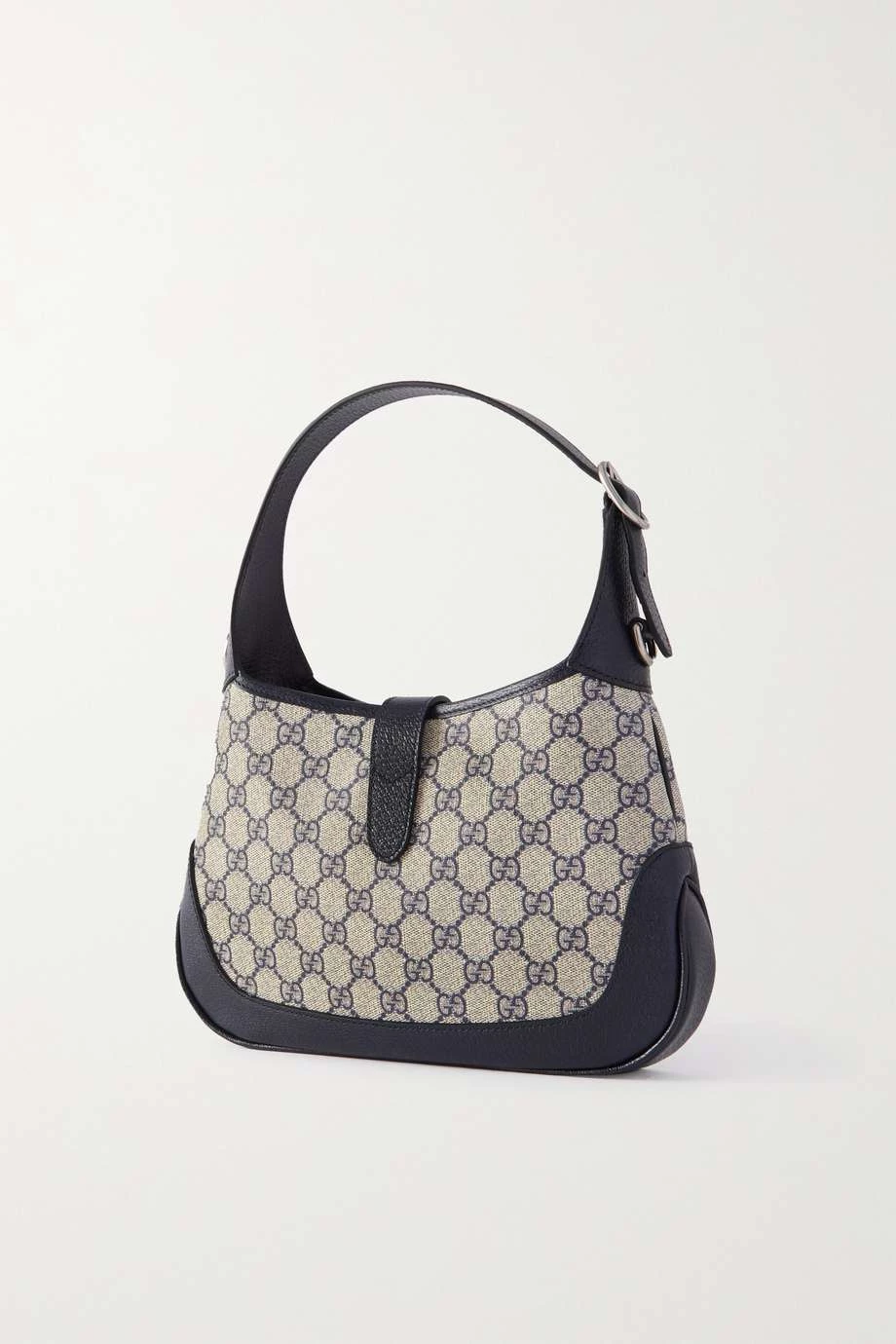 Die Form der „Jackie 1961“ Tasche von Gucci werden viele sofort wiedererkennen – diese Version wurde zudem mit einem noch vielseitigeren Riemen gestaltet. Das Accessoire besteht aus beschichtetem Canvas mit einem Muster aus dem „GG“-Logo und hat dunkelblaue Lederbesätze. Smartphone oder Schlüssel sind im Reißverschlussfach im Inneren sicher aufgehoben.