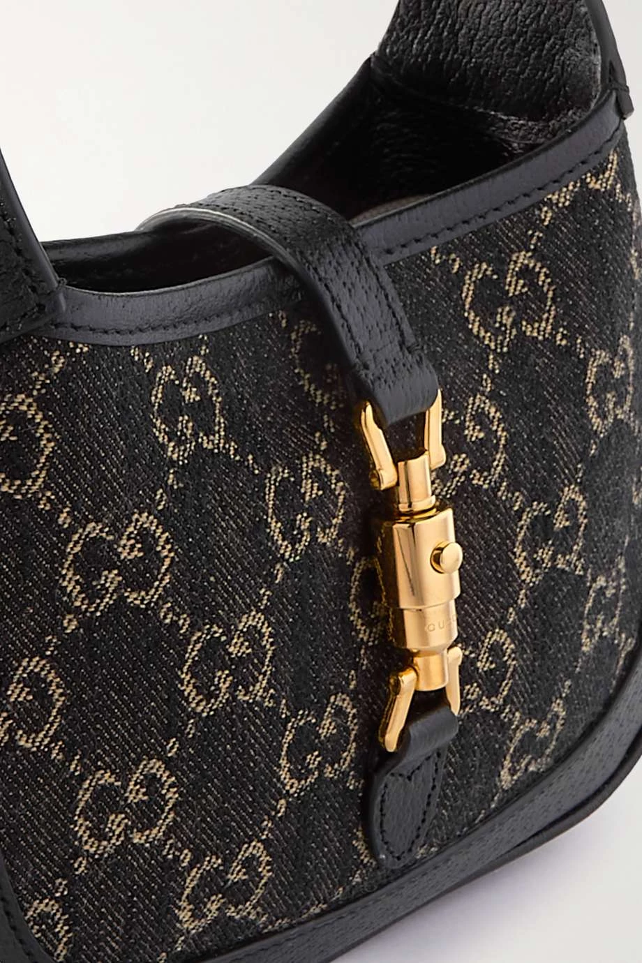 Die erstmals im Jahr 1961 herausgebrachte „Jackie“ Tasche von Gucci wird immer wieder überarbeitet, wobei die zeitlose abgerundete Silhouette jedoch stets erhalten bleibt. Diese Version im Miniformat wurde in Italien aus Denim mit eingewebtem Logomuster gefertigt, mit Besätzen aus strukturiertem Leder verstärkt und mit goldglänzenden Details vollendet. Der abnehmbare Schulterriemen wirkt überaus zeitgemäß.