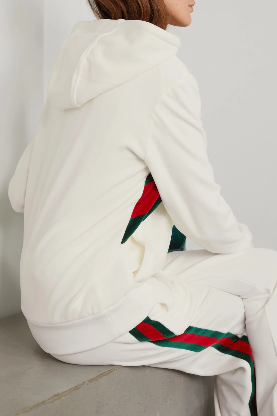 Diese Kapuzenjacke von Gucci erinnert an Vintage-Sportbekleidung. Das Modell aus weichem Jersey aus einer Baumwollmischung hat eine leicht lockere Form mit markentypischen Zickzackstreifen aus geschmeidigem Samt sowie einer „GG“-Logo-Applikation auf Brusthöhe.