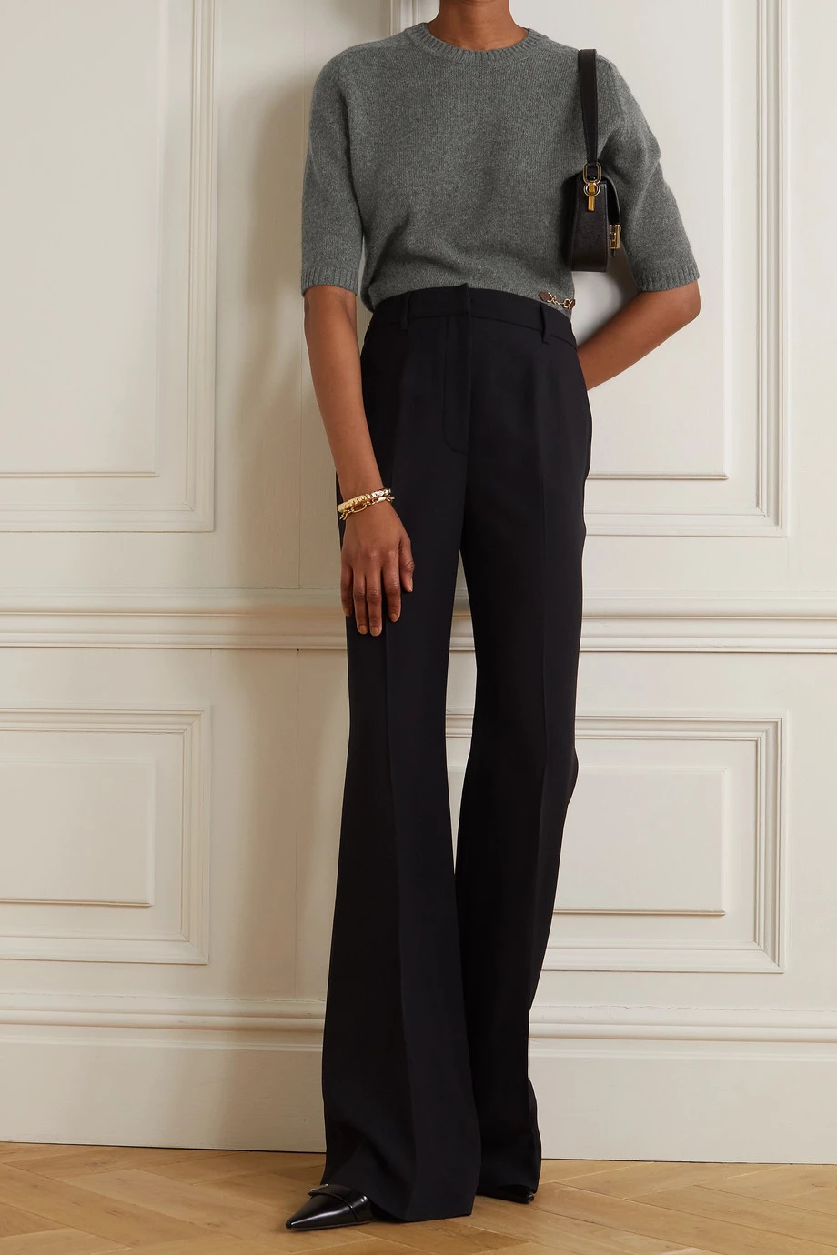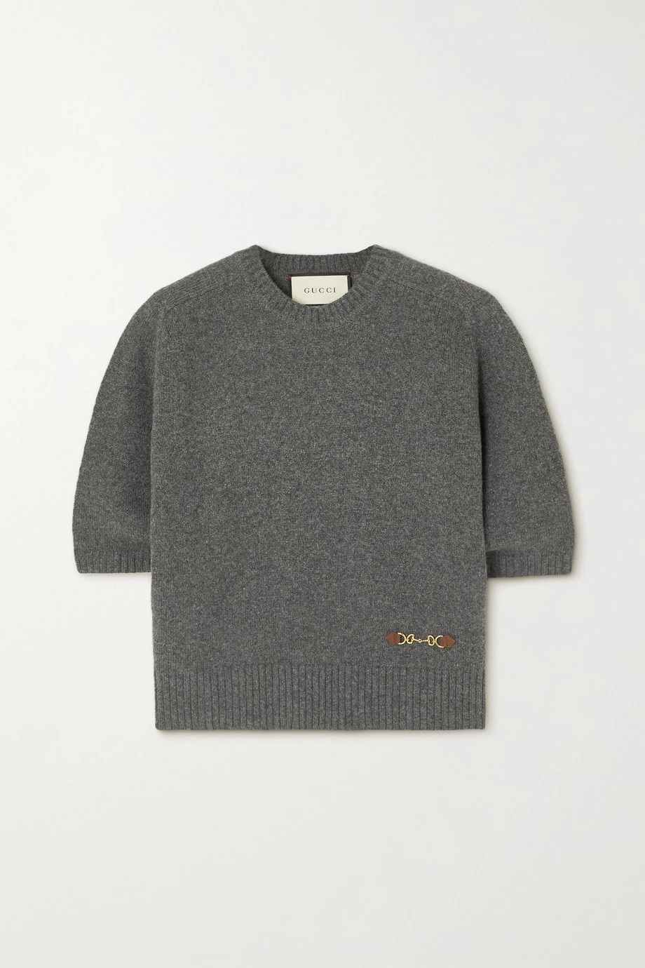 Dieser Pullover von Gucci ist der Beweis dafür, dass es oftmals kleine Elemente sind, die ein Design zu etwas Besonderem machen – wie etwa das „Horsebit“-Detail mit Lederbesätzen, das seit den 50er-Jahren ein Erkennungsmerkmal des Hauses ist. Das leicht lockere Modell wurde in Italien aus weichem Kaschmir gefertigt und mit Rippstrickbündchen versehen. Zu smarten Hosen passt es ebenso gut wie zu Jeans.