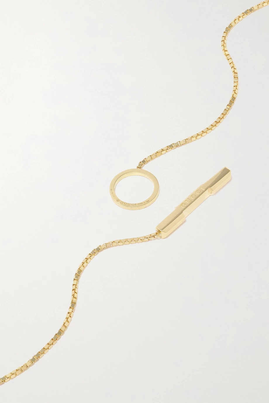 Diese Kette von Gucci entstammt der „Link to Love“ Kollektion, für welche das Haus mit zeitgemäßer Romantik experimentierte. Das Schmuckstück wurde in Italien aus 18-karätigem Gold gefertigt und mit einem schmalen Stabelement mit eingraviertem Markennamen verziert. Da Sie die Länge wahlweise kürzer oder länger stellen können, lässt es sich ideal mit anderen Modellen kombinieren.