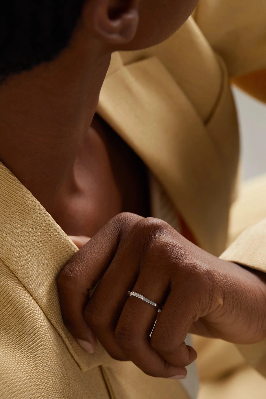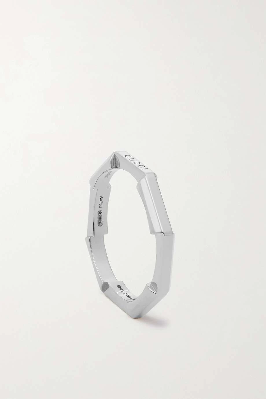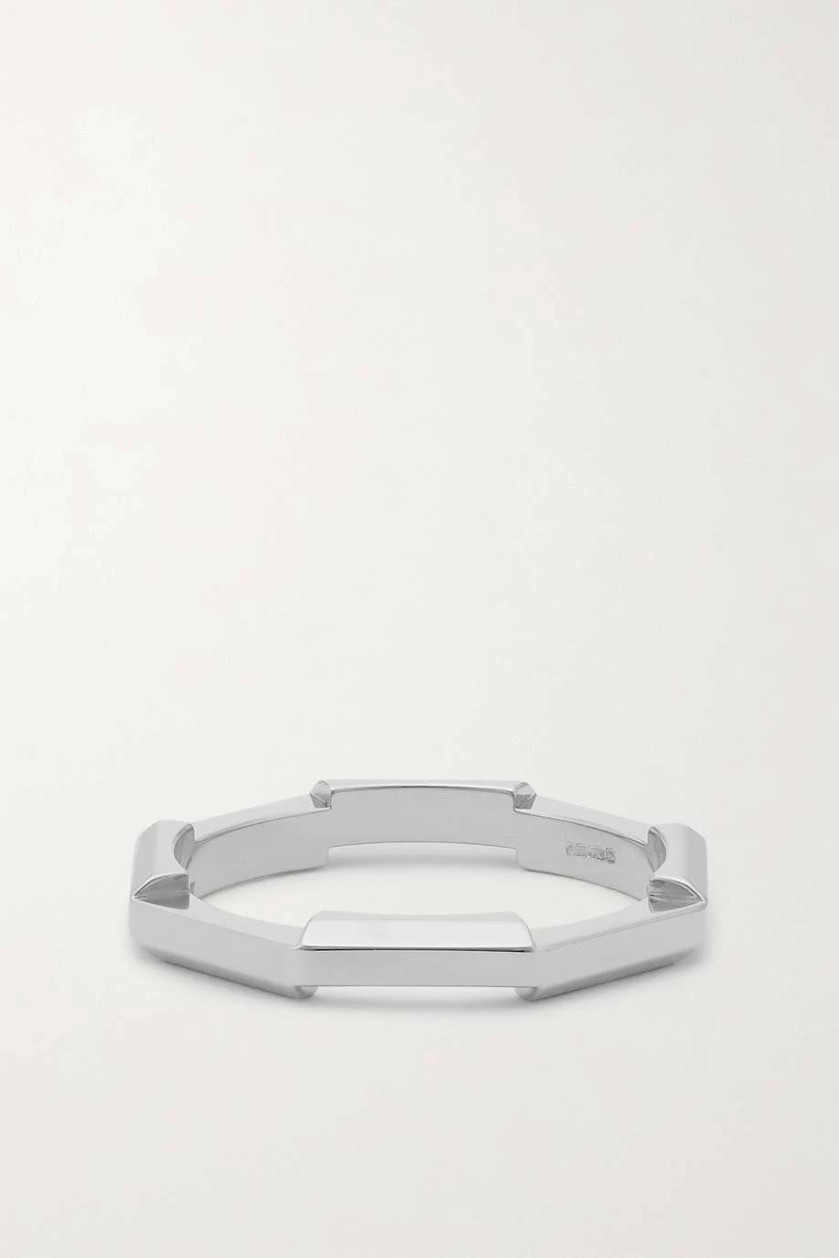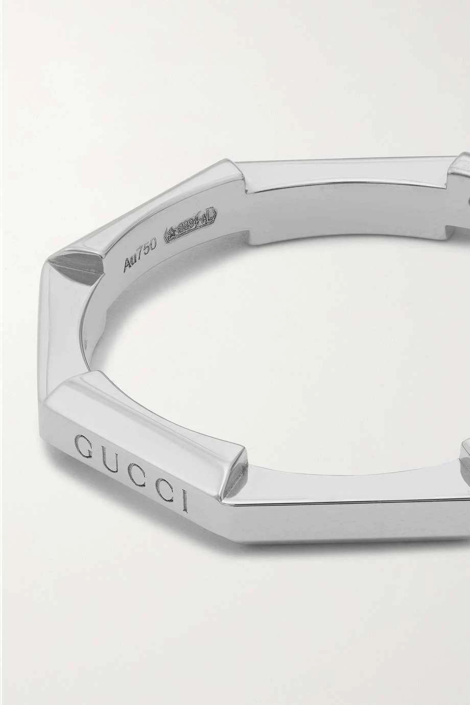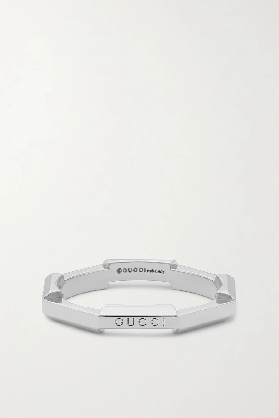 Die „Link to Love“ Kollektion von Gucci enthält Kreationen, die sich dank besonderer Mechanismen als Ausdruck von Liebe miteinander vereinen lassen. Dieser schmale Ring wurde in Italien aus 18-karätigem Weißgold gefertigt und mit einer dezenten Version des Markenlogos geprägt.