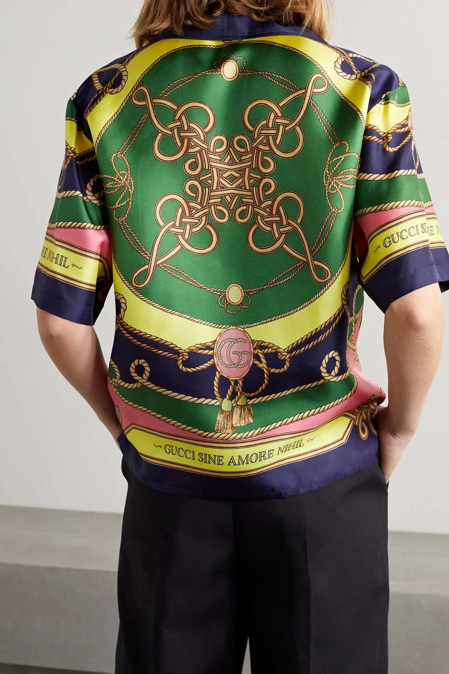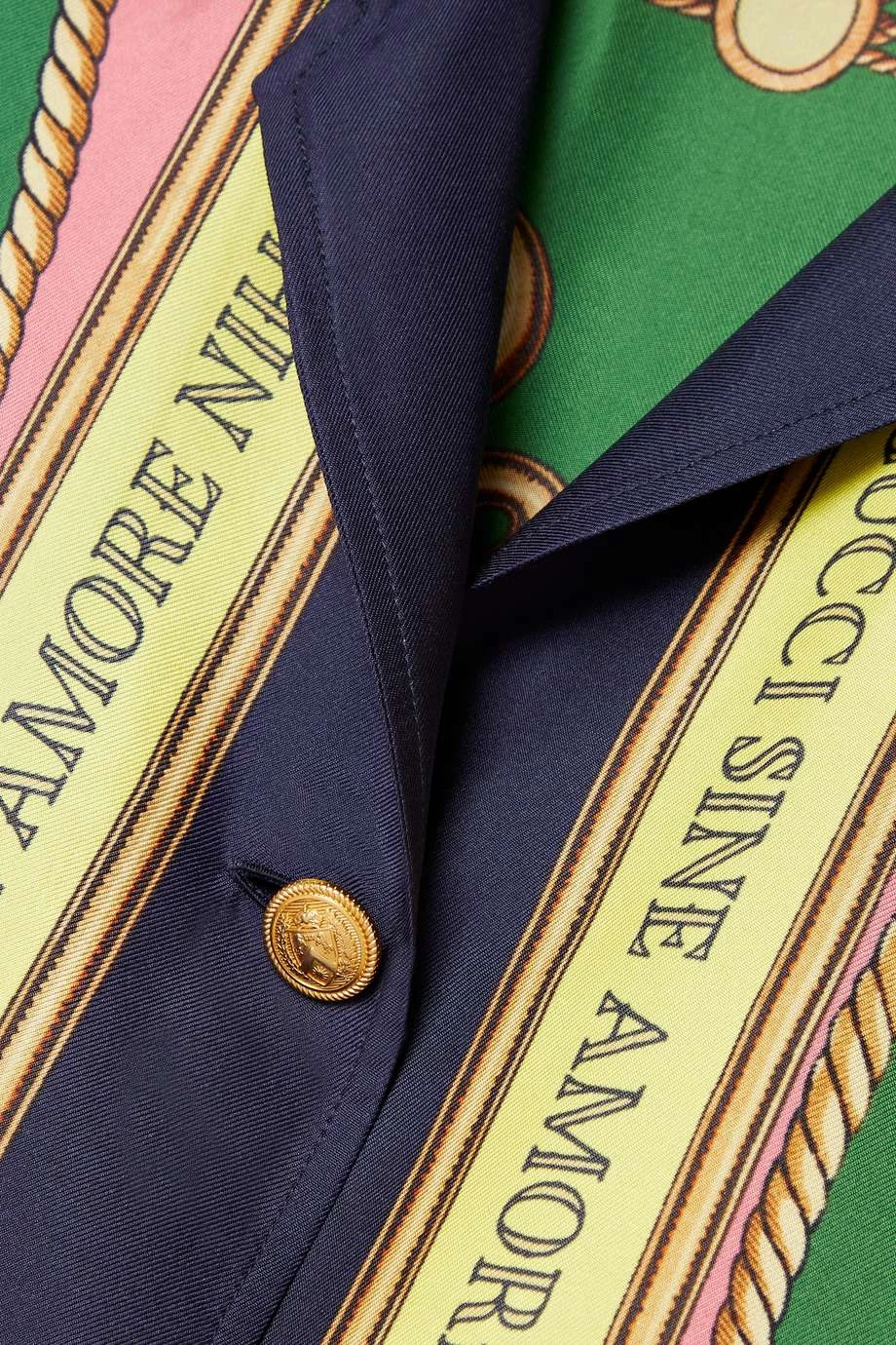 Dieses Hemd von Gucci besteht aus glänzendem Seiden-Twill, der mit einem bunten Muster aus wirbelnden Seilen und dem Schriftzug „Sine amore nihil“ (zu Deutsch: Nichts ohne Liebe) bedruckt ist. Das Modell hat einen Reverskragen und goldfarbene Knöpfe, die mit einem Wappen gestaltet sind.