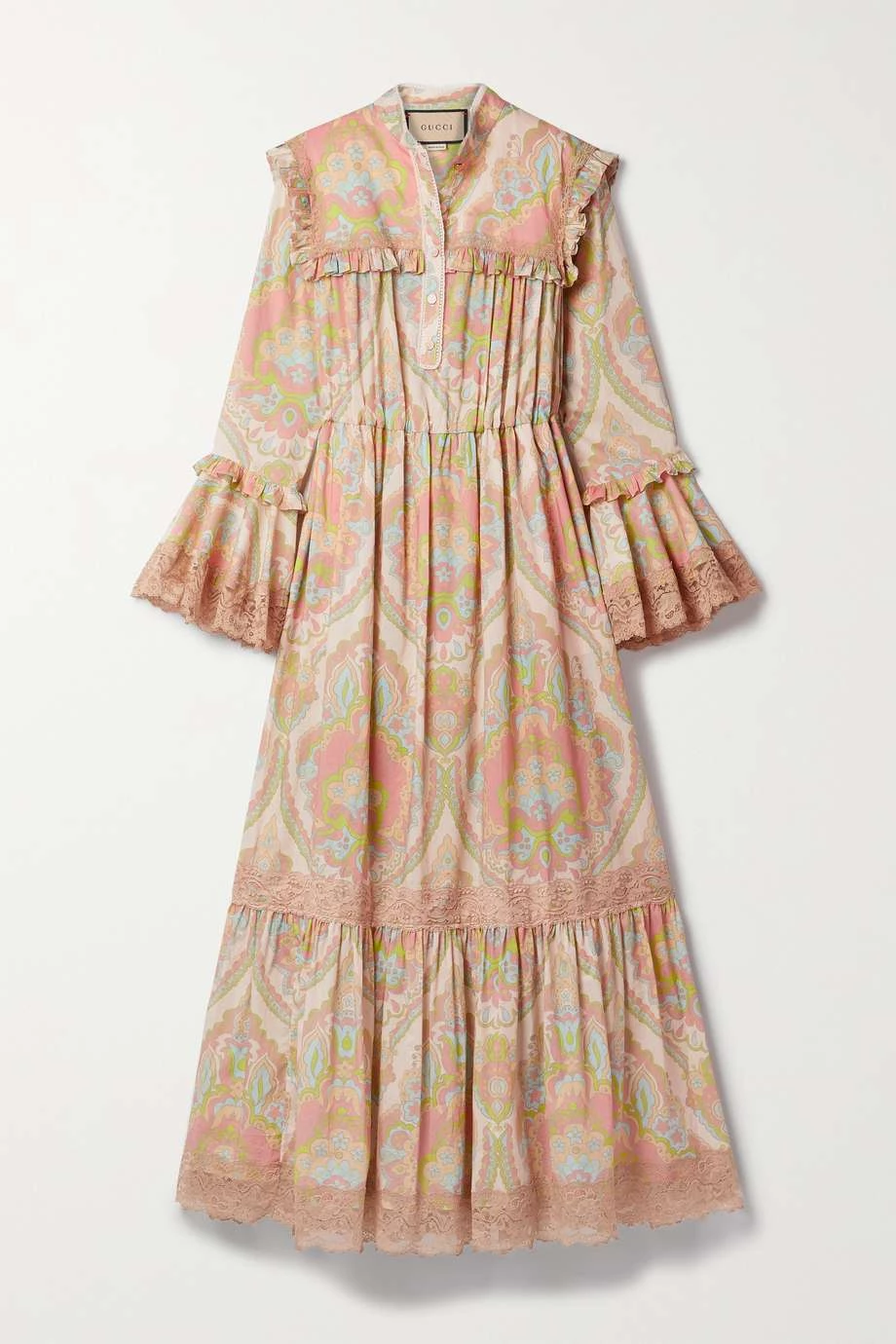 Dank Mandarinkragen, Glockenärmeln und Rüschen hat dieses Kleid von Gucci ein viktorianisch-romantisches Flair. Es wurde in Italien aus leichtem Baumwoll-Voile mit einem Blumenprint, der an Damast erinnert, gefertigt. Wenn Sie den Look der F/S 22-Laufstegshow anstreben, empfehlen wir Stiefel dazu.