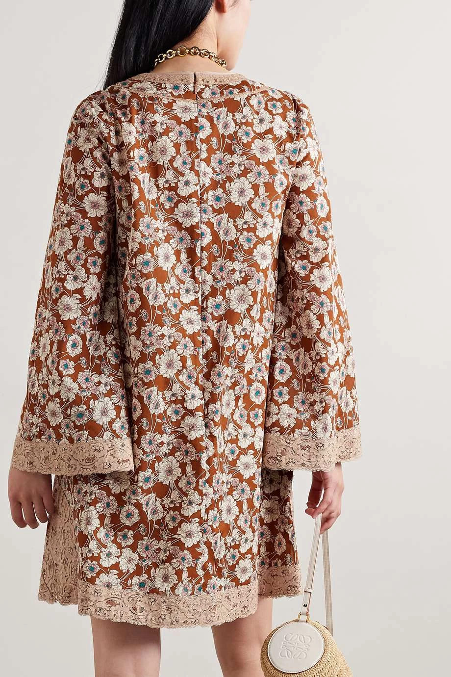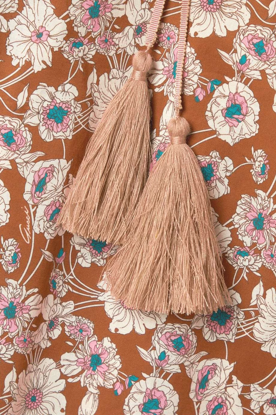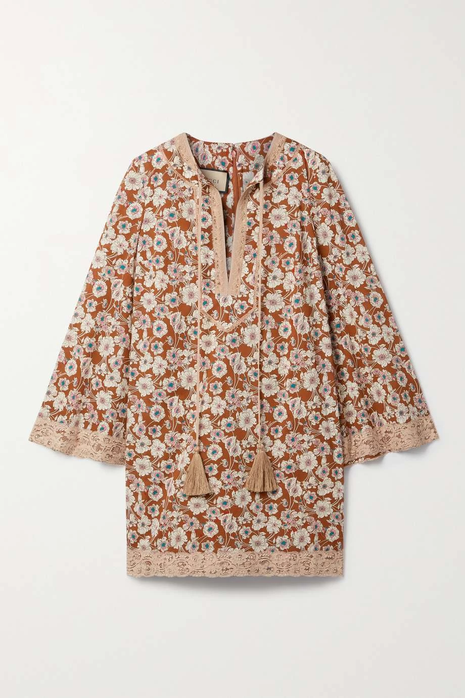 Dieses Minikleid von Gucci verströmt legeres Bohème-Flair. Es wurde in Italien aus leichtem Voile aus einer Baumwollmischung gefertigt und mit malerischen Blumen bedruckt. Das lockere Modell zeigt sich zudem mit Spitzenbesätzen. Lassen Sie die Bänder mit Troddeln wahlweise offen.