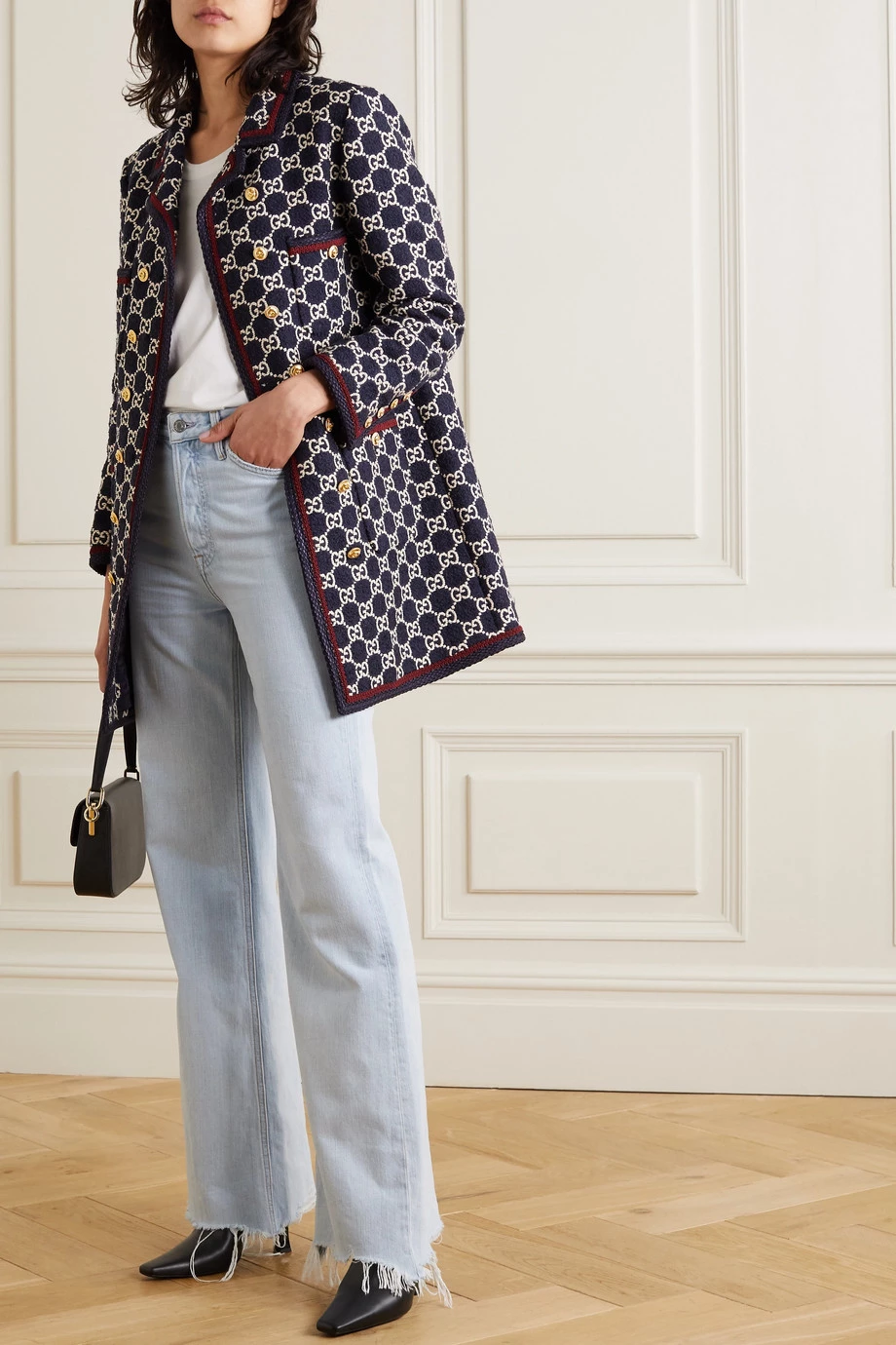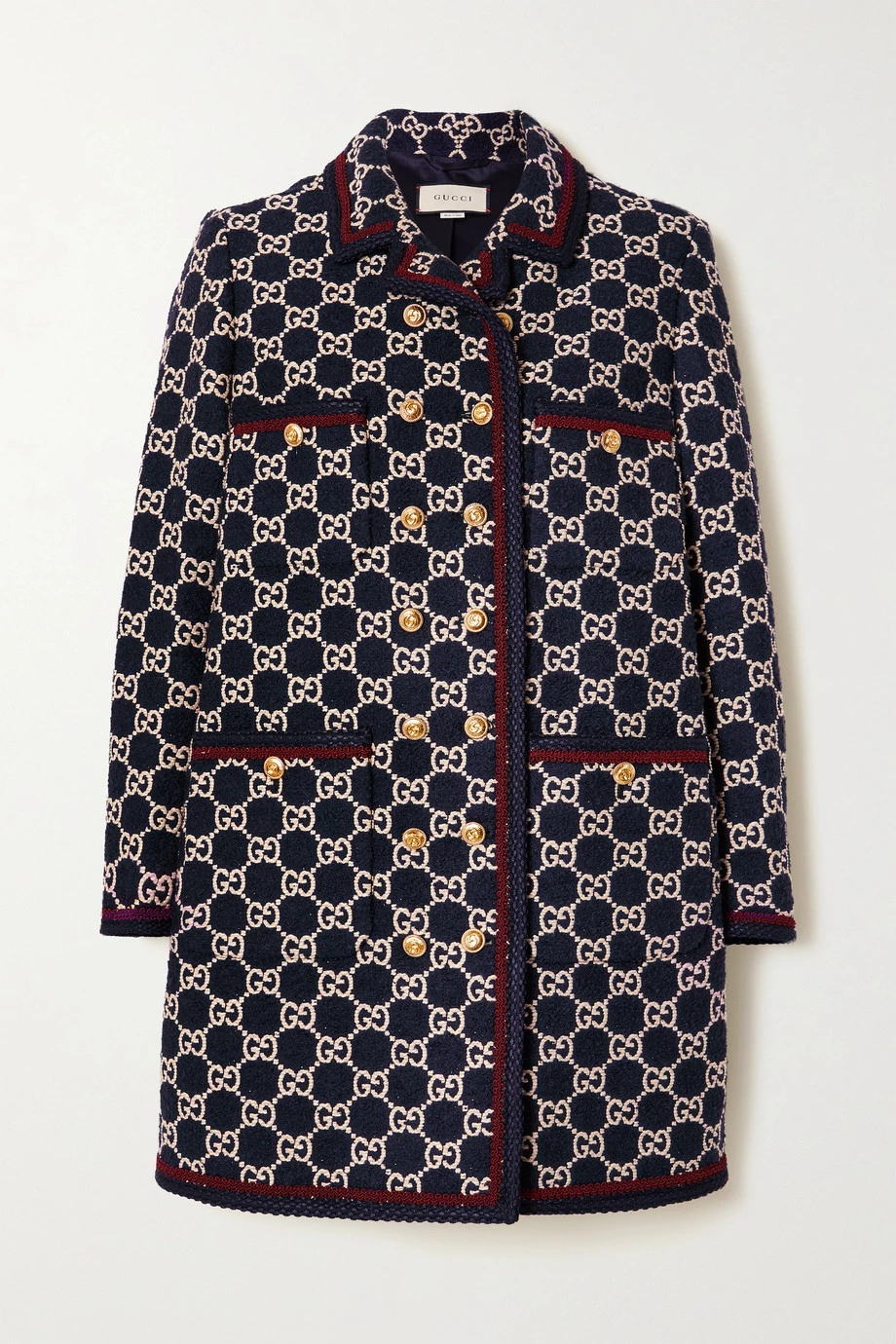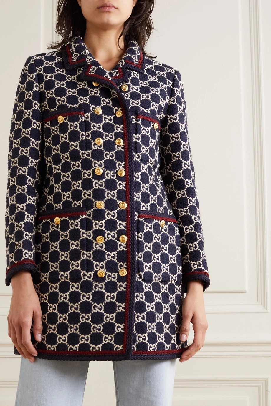 An diesem Mantel von Gucci befinden sich einige Markenzeichen des Hauses: glänzende Knöpfe mit Logoprägung und Webstreifen in klassischem Navyblau-Rot. Das leicht lockere, doppelreihige Modell wurde in Italien aus Bouclé-Tweed aus einer Baumwollmischung und mit einem eingewebten Muster aus dem „GG“-Monogramm gefertigt. Ziehen Sie es beispielsweise über Minikleidern oder Jeans an.