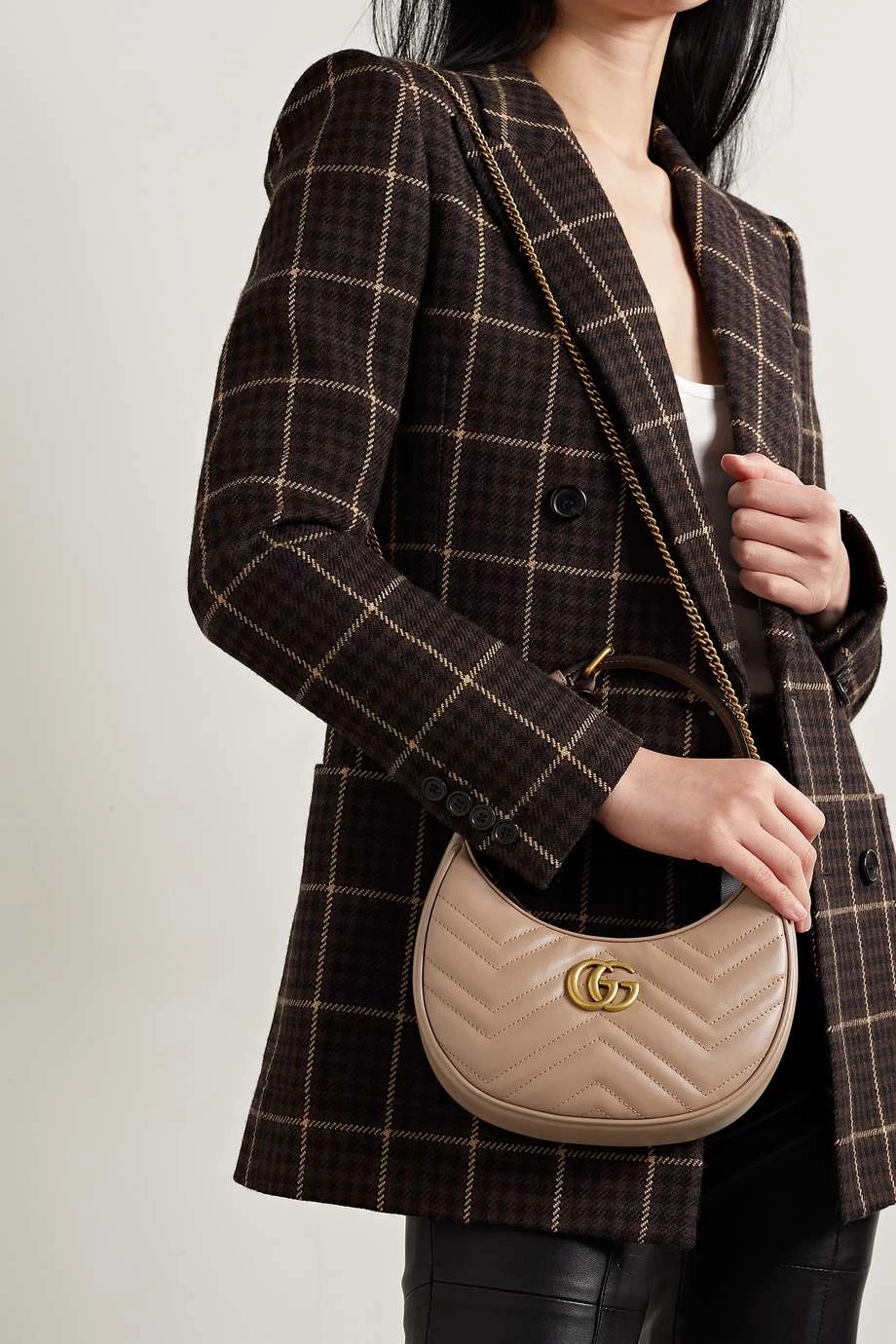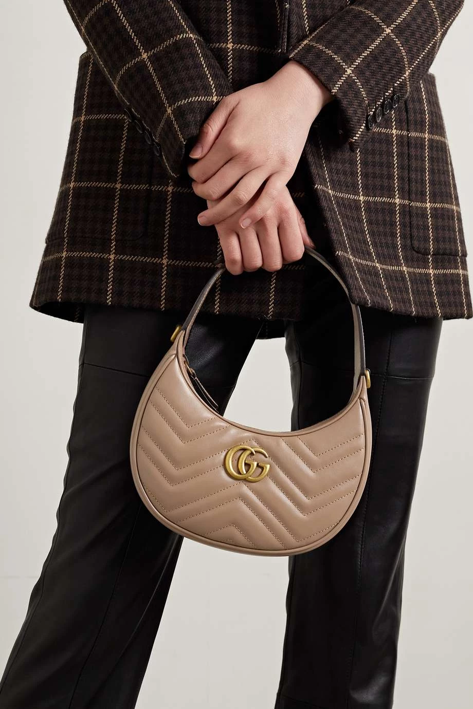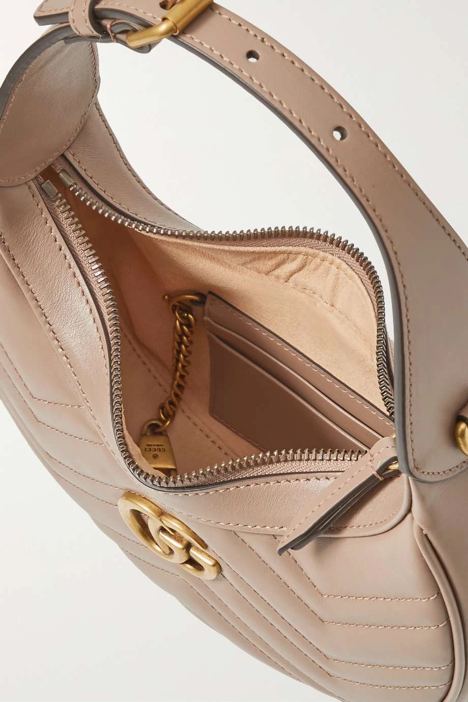 Diese Schultertasche in Sattelform von Gucci gehört zu der ikonischen „Marmont“ Reihe des Hauses. Das Accessoire wurde in Italien aus Leder im Rosaton „Porcelain Rose“ gefertigt und mit dem markentypischen gesteppten Finish sowie einem goldfarbenen „GG“-Emblem an der Vorderseite gestaltet. Im kompakten Inneren findet sich ein Kartenschlitz, dank dem auf ein Portemonnaie verzichtet werden kann, während sich der Kettenträger vollständig abnehmen lässt, wodurch ein schlichterer Look entsteht.