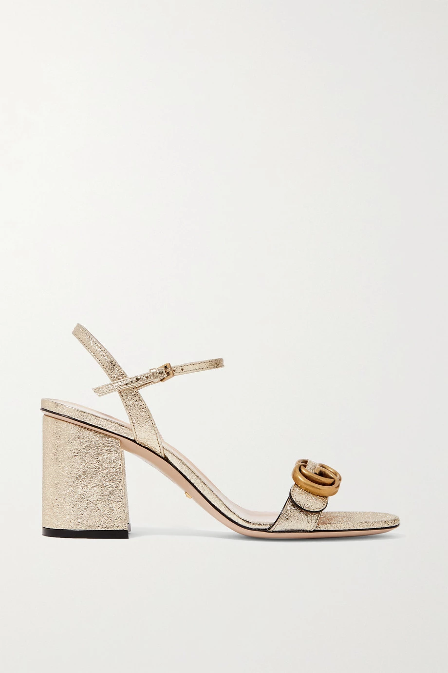 Der massive Blockabsatz der „Marmont“ Sandalen von Gucci steht in einem schicken Kontrast zu den schmalen Riemchen des Modells, das durch das ikonische „GG“-Emblem auf Anhieb erkennbar ist. Tragen Sie das goldfarbene Paar aus hochglänzendem Craquelé-Leder je nach Anlass zu Röcken, Jeans oder Tailoring.