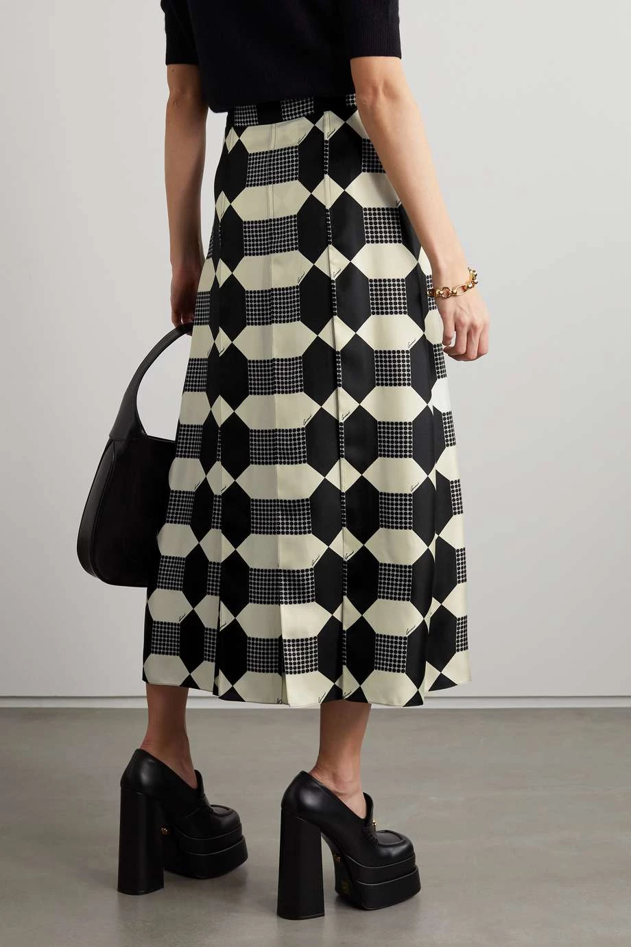 Dieser smarte Midirock von Gucci wurde in Italien aus fließendem Seiden-Twill gefertigt und zeichnet sich durch ein auffälliges Muster aus geometrischen Motiven aus. Das Modell sitzt an der Taille und schwingt dank der Falten beim Gehen sanft mit. Wir empfehlen einen verkürzten Pullover und Brogues dazu.