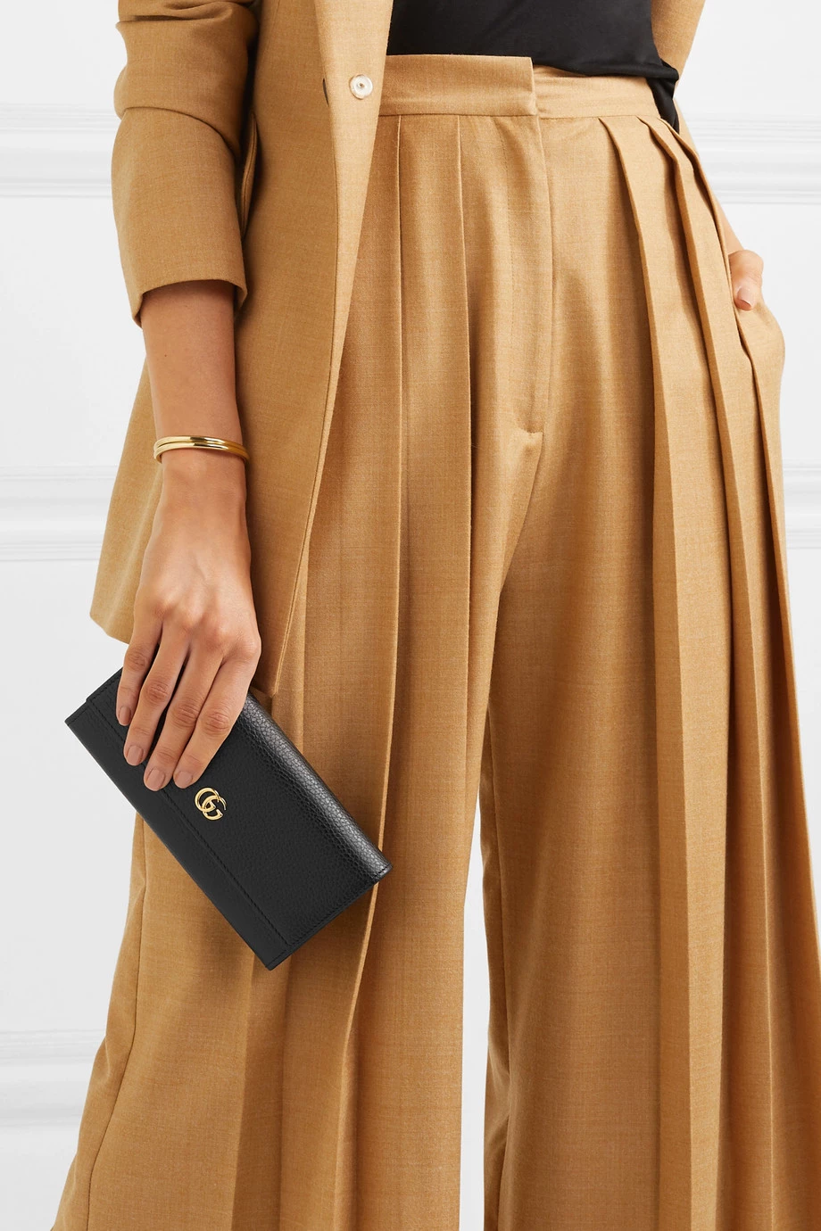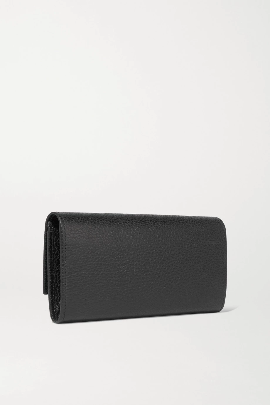 Dieses Portemonnaie von Gucci wurde in Italien aus chromfrei gegerbtem strukturiertem Leder gefertigt und lediglich mit dem berühmten „GG“-Detail verziert. Im Inneren finden sich ein Reißverschlussfach sowie mehrere Schlitze für Karten, Scheine und Quittungen. Das Accessoire lässt sich problemlos in einer der „Marmont“ Totes des Labels unterbringen.