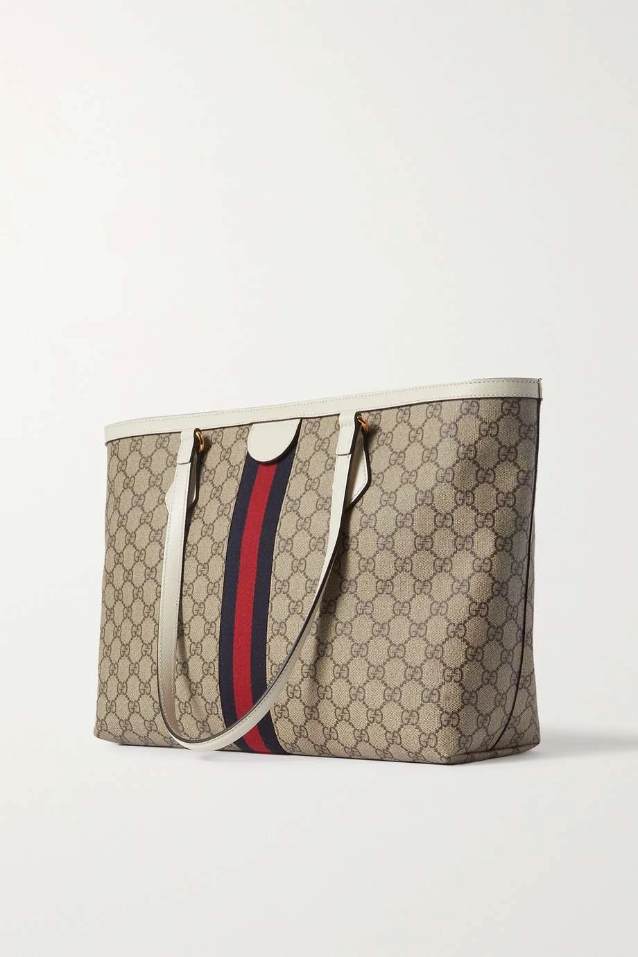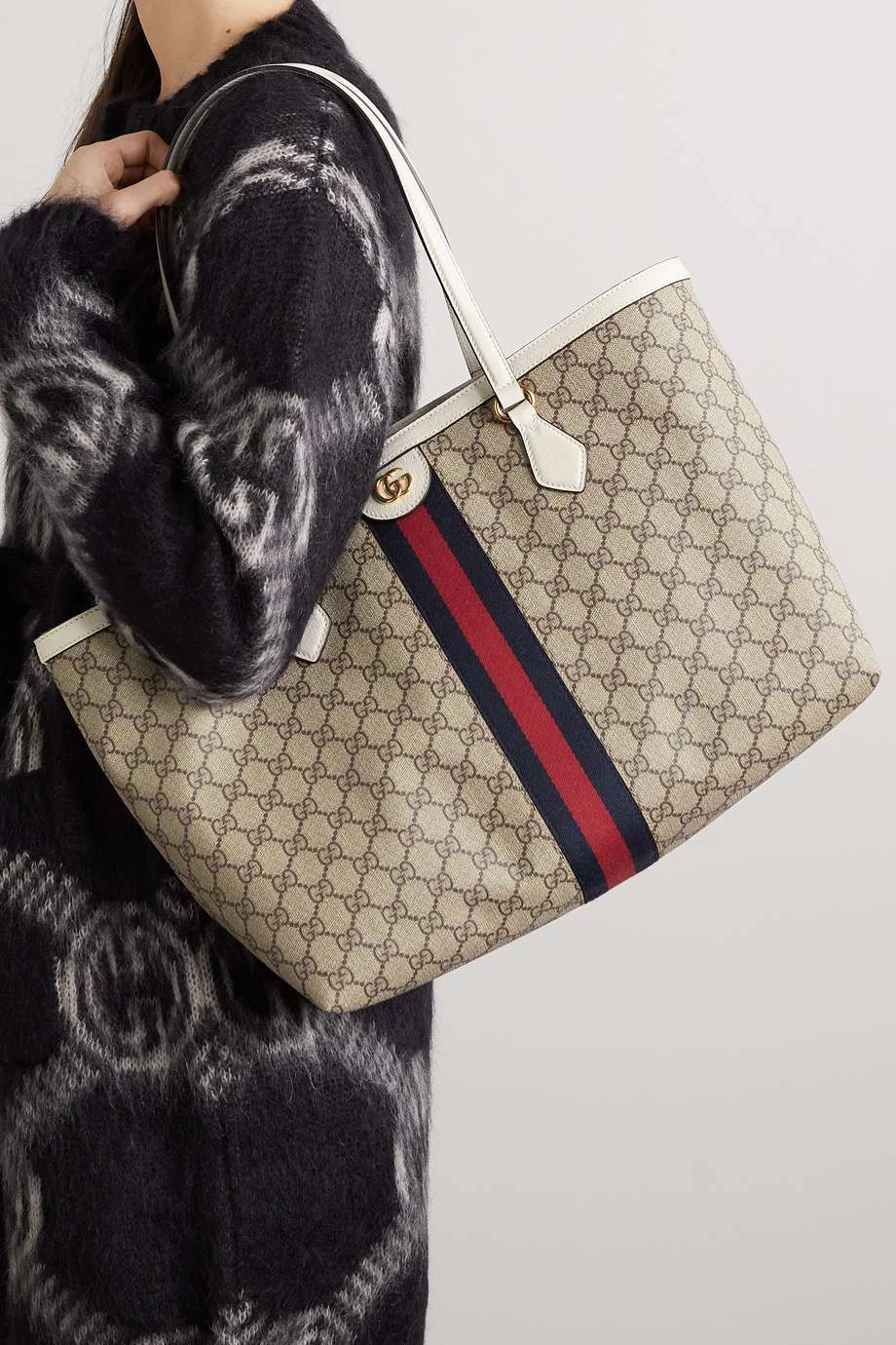 Die „Ophidia“ Tote aus robustem beschichtetem Canvas von Gucci ist mit strukturiertem Leder eingefasst und weist alle typischen Markenzeichen des Hauses auf – Webstreifen, das brünierte „GG“-Logo sowie das „Supreme“-Muster. Im geräumigen Inneren findet sich ein Reißverschlussfach sowie Platz für alle wichtigen Alltagsbegleiter.