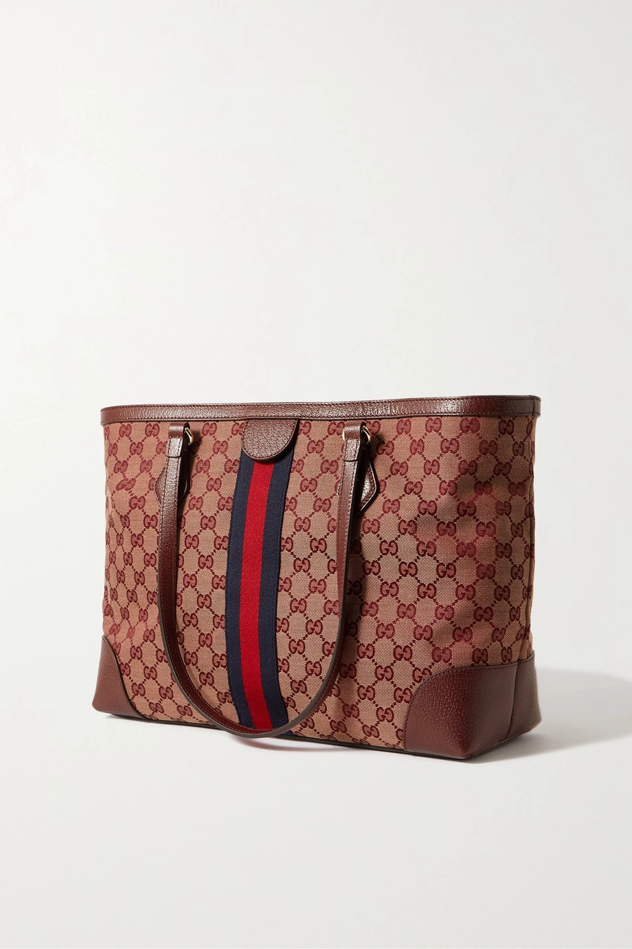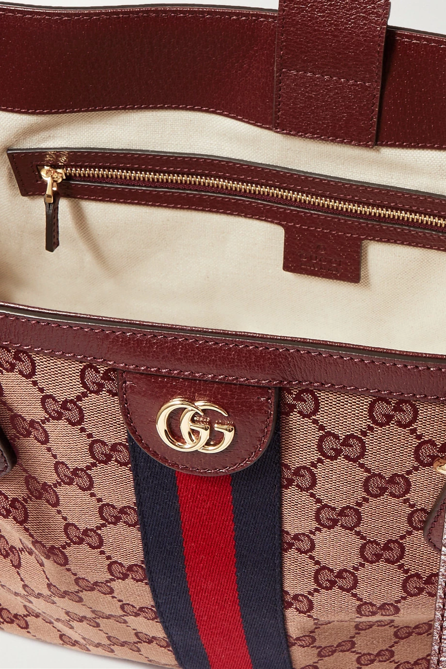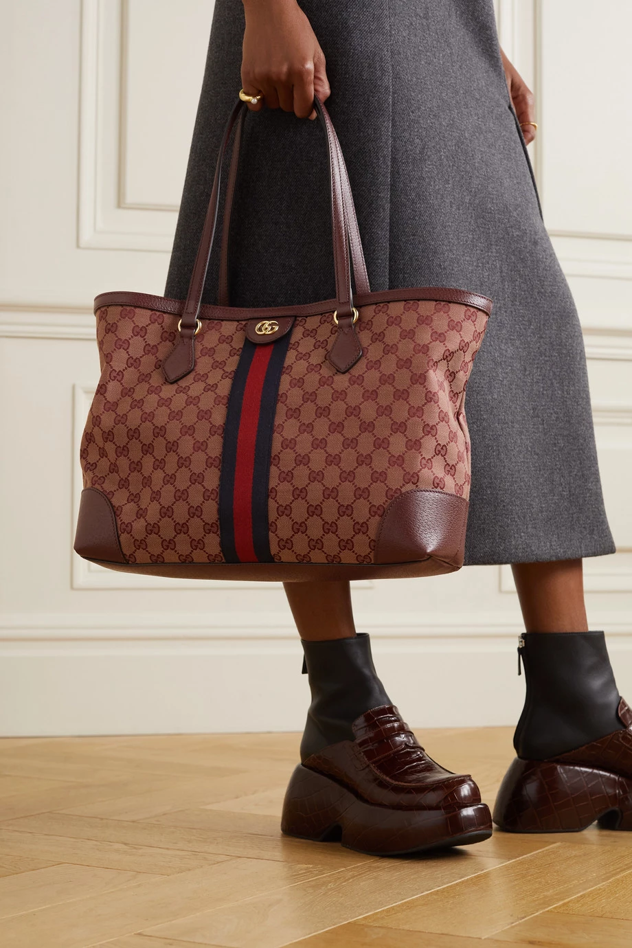 Die „Ophidia“ Tote von Gucci weist alle typischen Markenzeichen des Hauses auf – das gestreifte Webband, das brünierte „GG“-Logo sowie das „Supreme“-Muster. Im geräumigen Inneren findet sich ein Reißverschlussfach und Platz für alle wichtigen Alltagsbegleiter. Diese Version besteht aus robustem Canvas und ist mit Leder eingefasst.