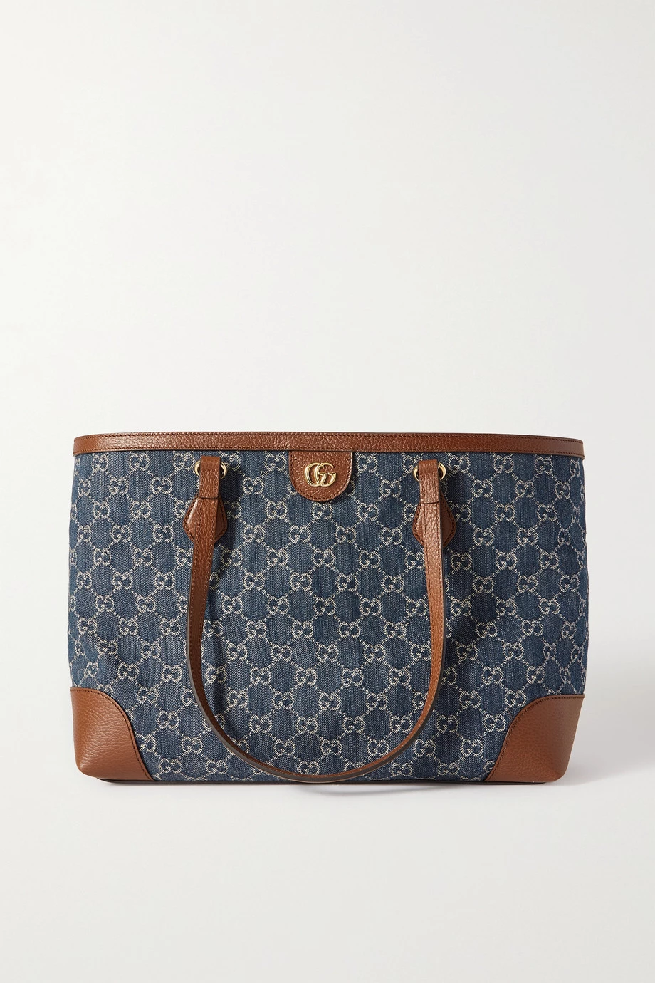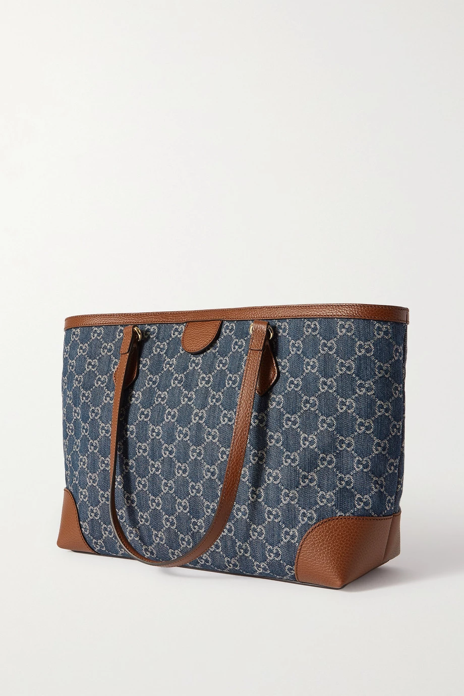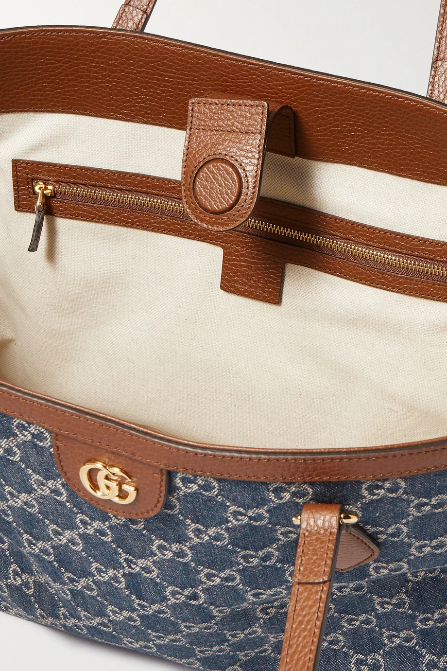 Diese neu aufgelegte Version der „Ophidia“ Tote von Gucci besteht aus Denim mit Logomuster. Das in Italien gefertigte Modell wurde neben goldglänzenden Details auch mit Besätzen aus braunem strukturiertem Leder gestaltet, die vor Abnutzungen schützen. Das geräumige Innere ist mit Canvas ausgekleidet und hat ein praktisches Reißverschlussfach.
